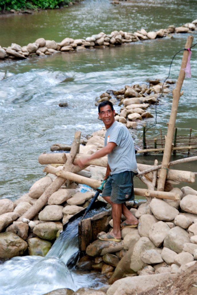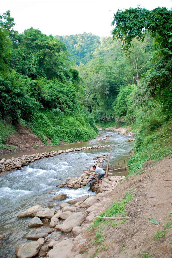Nach der Schule und dem Tempel haben wir auch noch das Flüsschen angeguckt, welches hier aus den Bergen kommt und in den Mekong fließt. Die Dorfgemeinschaft nutzt den Fluss zur Stromgewinnung, zum Baden und zum Waschen. Und die Kinder haben einen Riesenspaß daran, vom Ufer in den Fluss zu springen.