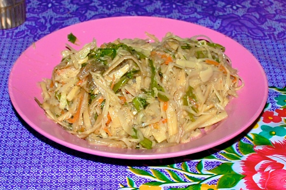 Anschließend gab es Abendessen – die gleiche Suppe wie auf dem Boot, Larb (http://en.wikipedia.org/wiki/Larb), Klebreis und zum Abschluss Ananas. Insbesondere Larb war sehr lecker!