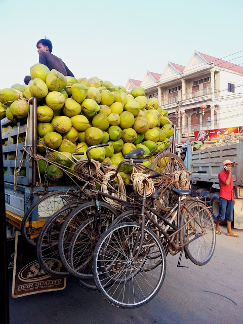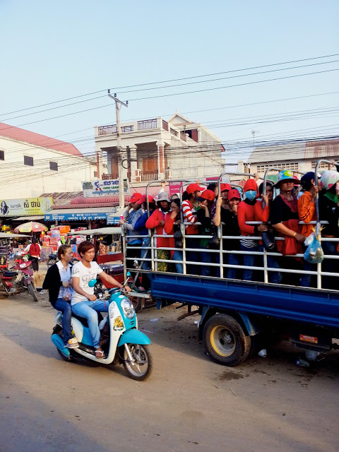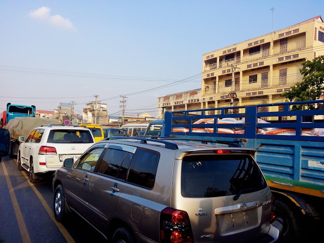 Gegen 12 Uhr bin ich zum Hotel zurückgekehrt, habe noch schnell bei einem benachbarten italienischen Restaurant einen Teller Pasta gegessen und mich dann zum Büro von Giant Ibis begeben, um den Bus zurück nach Phnom Penh zu nehmen. Es ging pünktlich los, ich hatte wieder einen guten Sitzplatz mit viel Beinfreiheit, das Wifi funktionierte ebenfalls gut und wir kamen gut voran. Allerdings nur, bis wir den Stadtrand von Phnom Penh erreichten. Von hier an war Stau. Es herrschte absolutes Chaos auf der Straße. Autos versuchten sich von links und rechts in den Verkehr auf der Hauptstraße einzufädeln oder diese zu queren – ohne Hilfe von Ampeln. Aus der eigentlich in jeder Richtung zweispurigen Straße wurde plötzlich eine Straße, auf der stadteinwärts auf vier Spuren gefahren wurde, sodass diejenigen, die stadtauswärts unterwegs waren, auf den unbefestigten Seitenstreifen ausweichen mussten. Abenteuerlich. Aber spannend.
