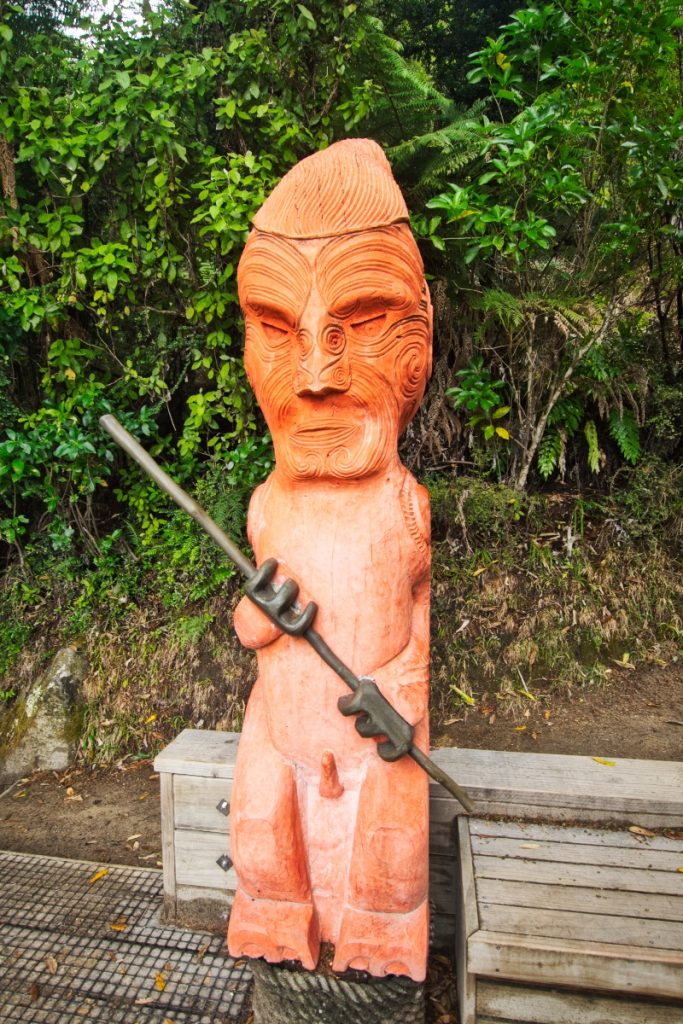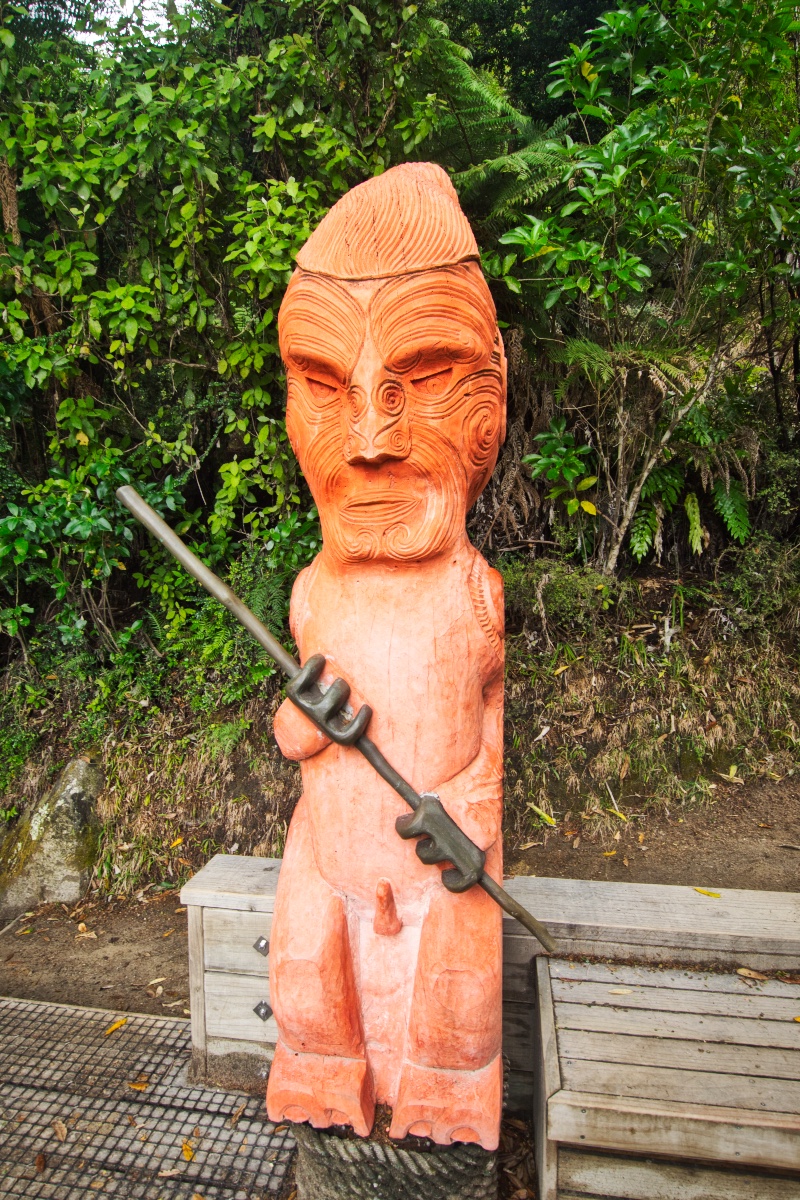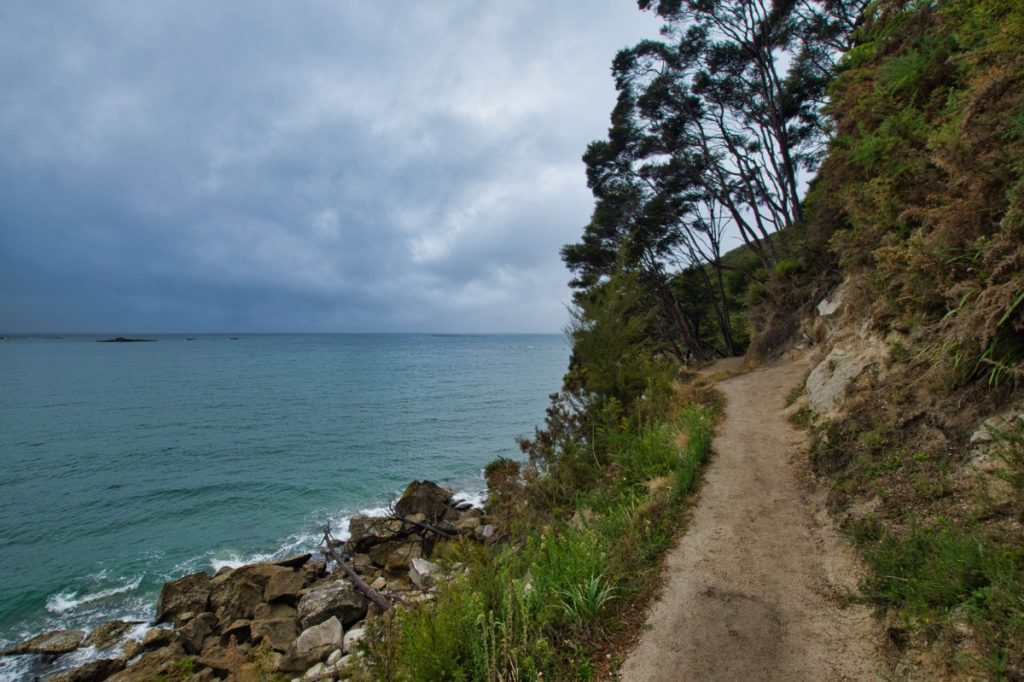 Nach nicht einmal zehn Minuten kam der schöne kleine Medlands Beach in Sicht. Hier hatte man bei schönerem Wetter sicher mehr Zeit verbringen können, aber ich habe nur schnell ein Foto gemacht und die Statue fotografiert, die am Wegesrand aufgestellt war, und habe meine Wanderung fortgesetzt.