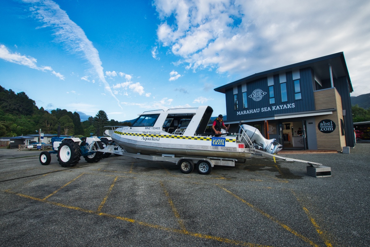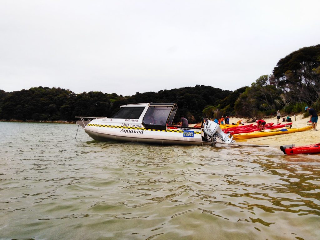 Bei Marahau Sea Taxis sind wir noch auf dem Land in unser Boot gestiegen und dann sind wir mit dem Boot auf dem Anhänger von einem Traktor rückwärts ins Meer gefahren worden. Das Meer weicht bei Ebbe so weit zurück, dass dies nicht anders möglich ist.