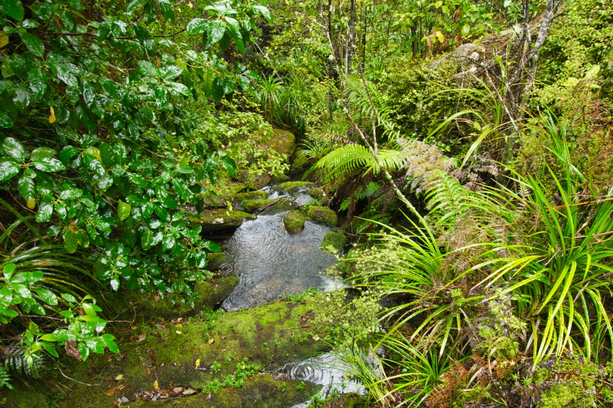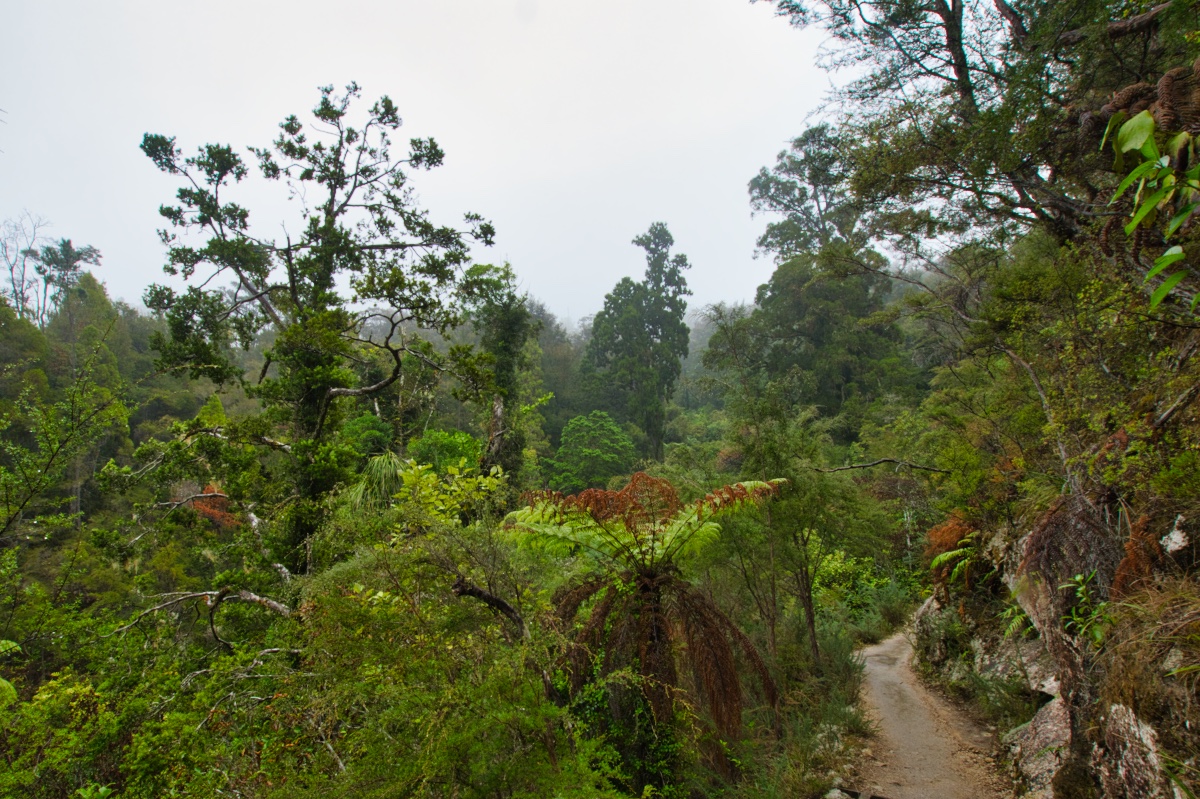 Nach der Überquerung des Falls River stieg der Weg ziemlich steil an (was man auf den Bildern allerdings nicht sieht) und ich kam ziemlich ins Schnaufen. Meine Kamera hatte ich zwischenzeitlich in das mitgeführte „Emergency Rain Cover“ verpackt und konnte so trotz Regens weiter Bilder machen. Das hat auch ganz gut funktioniert, abgesehen davon, dass sich im Rain Cover nach einer Weile Kondenswasser gebildet hat. Aber das war nicht weiter schlimm.
