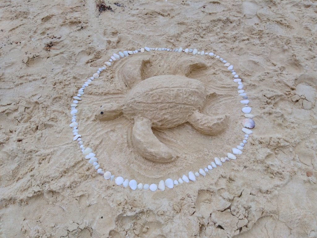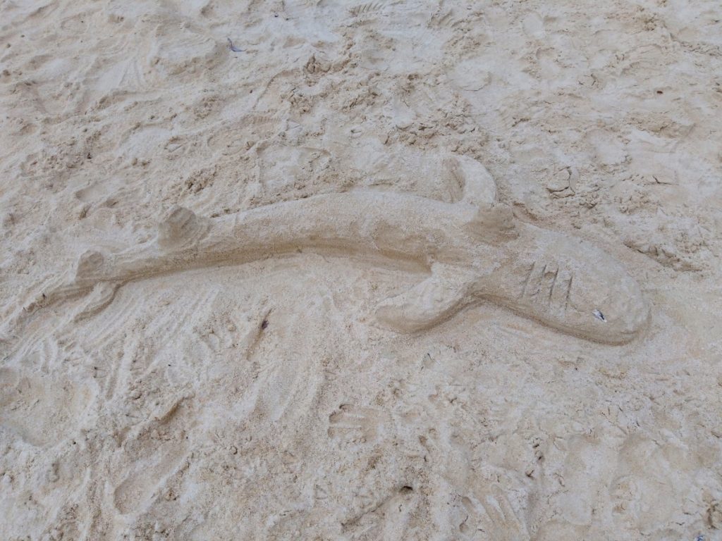 Nach einer Weile bin ich dann ans andere Ende des Strandes gelaufen, wo ich vom Wassertaxi eingesammelt werden sollte. Dabei habe ich noch zwei Kunstwerke entdeckt, die irgendjemand aus Sand geformt hatte.