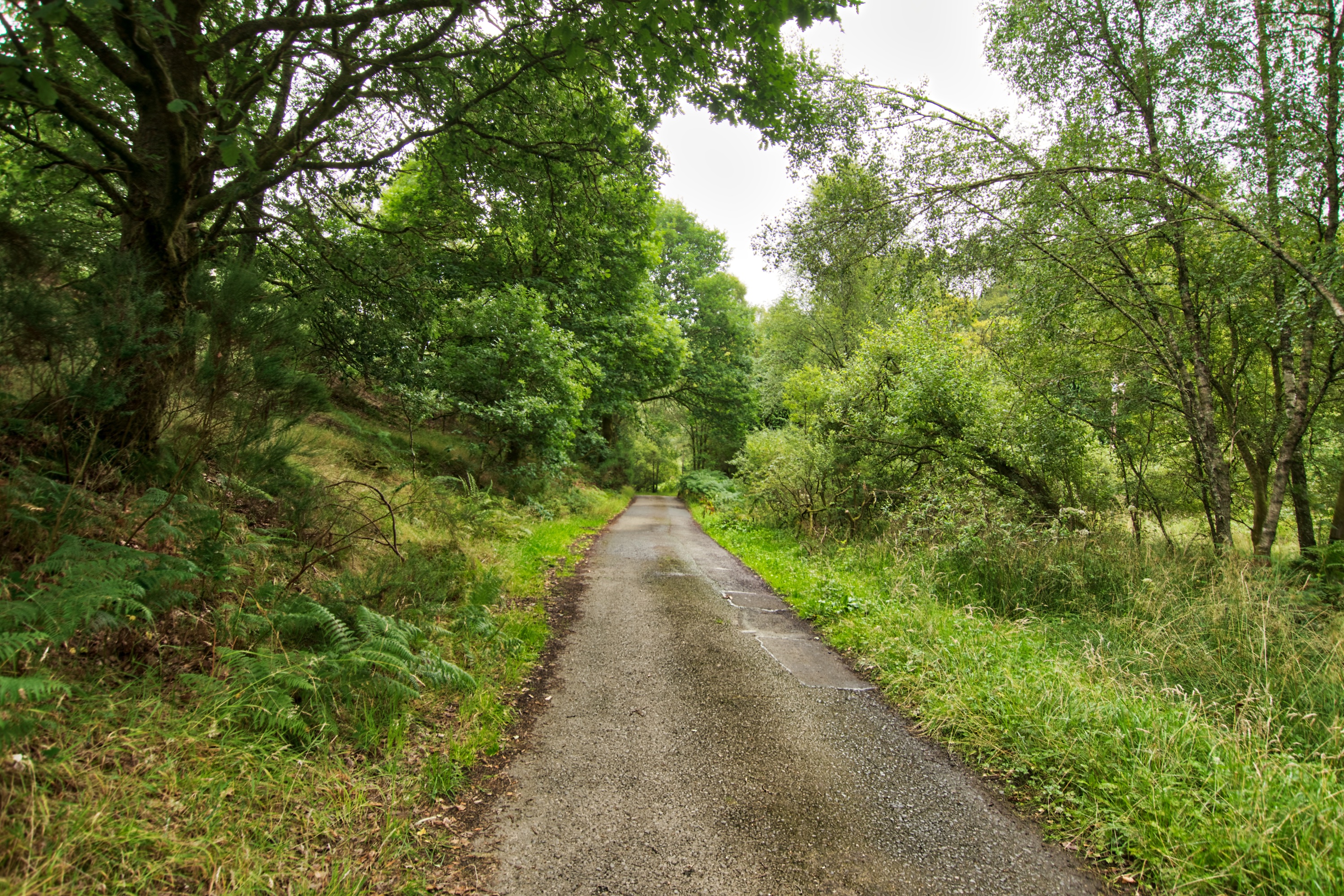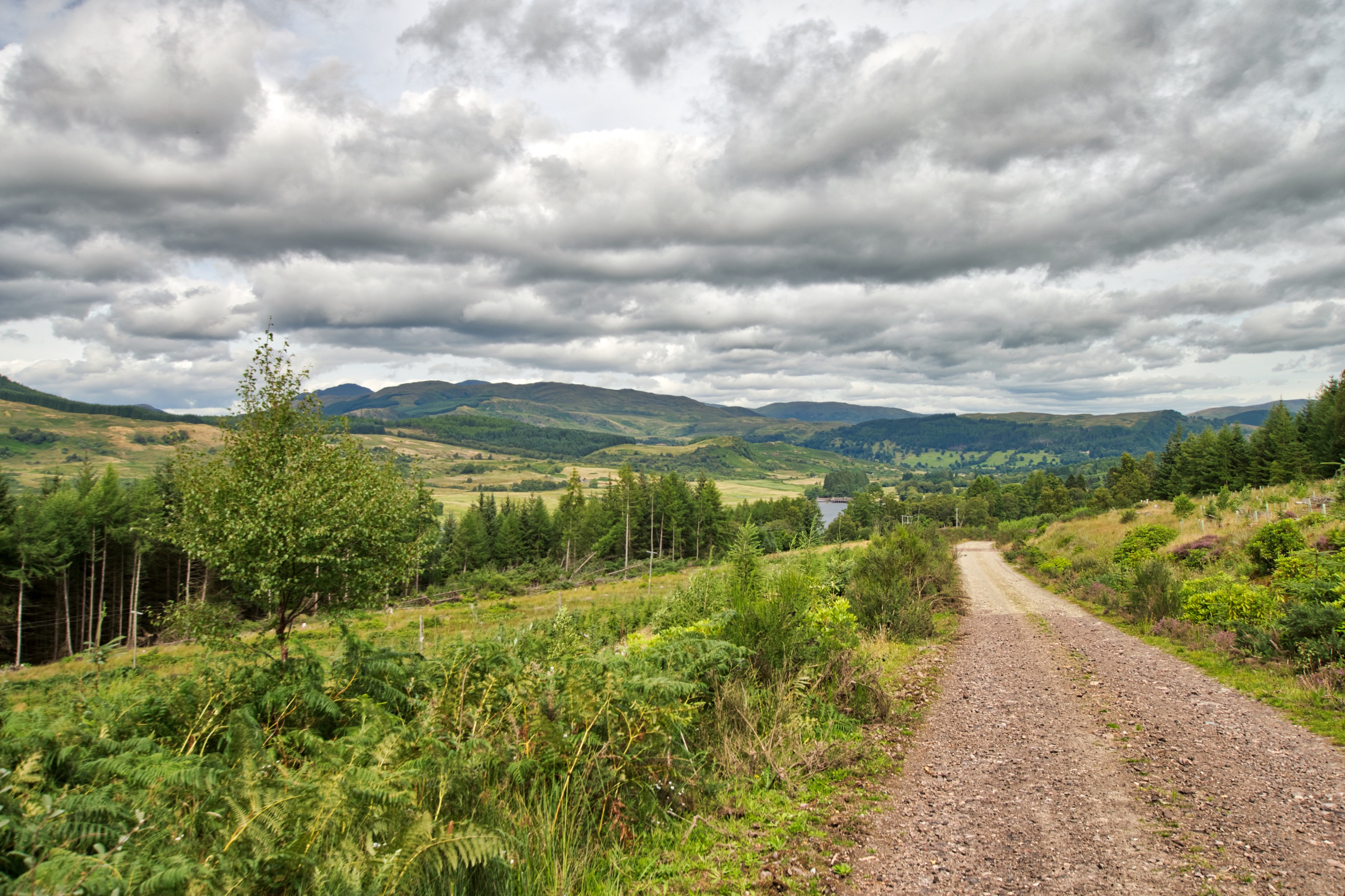 Aber der Rob Roy Way bog kurze Zeit später nach rechts ab und verlief bergauf auf einer Schotterstraße. Diese letzte, langanhaltende Steigung war eine echte Herausforderung. Aber wir haben es irgendwie geschafft und am Ende der Schotterstraße führte ein kleiner Trampelpfad hinunter nach Callander, wo wir gegen 16:15 angekommen sind.