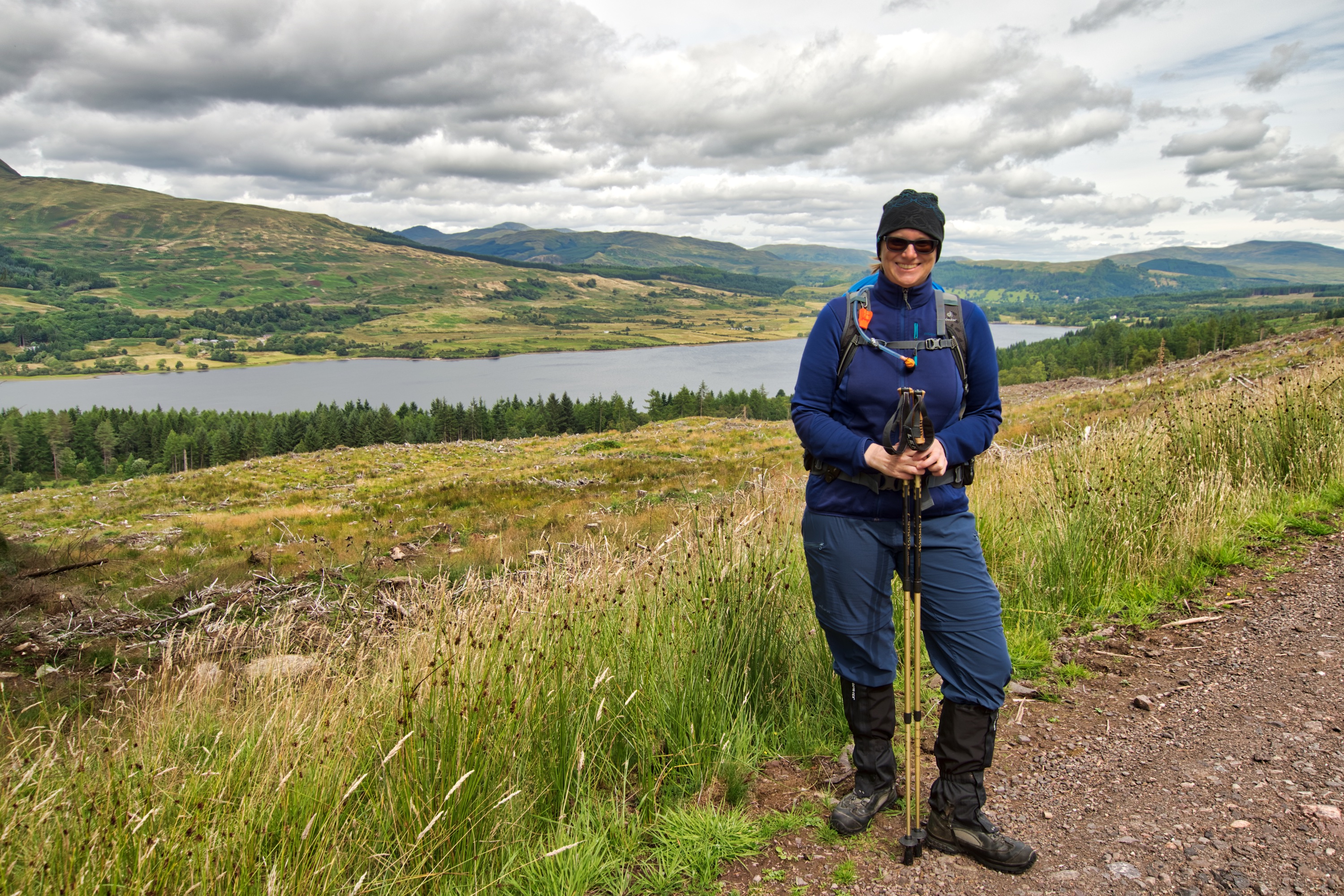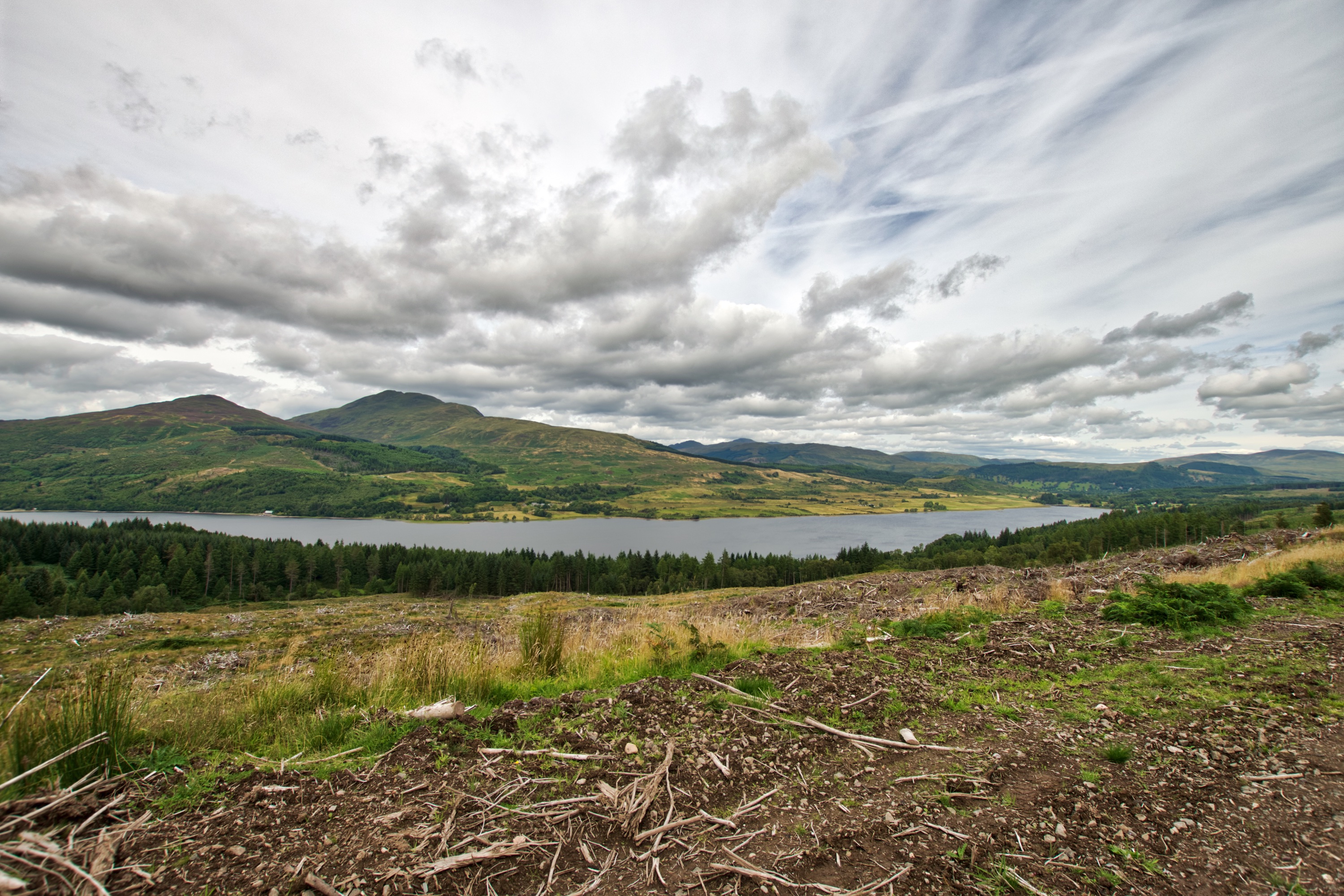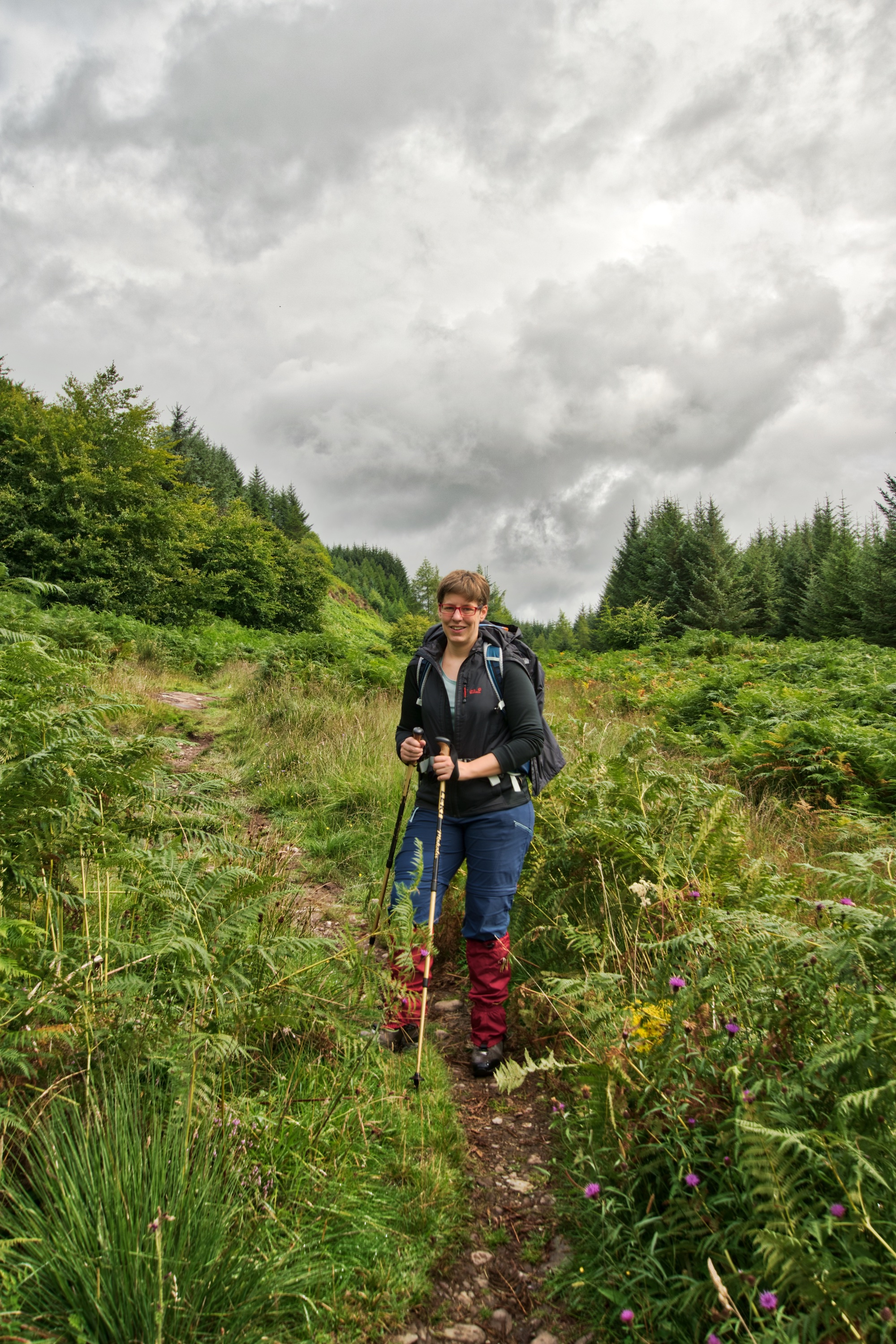 Und es war auch gut so! Denn da wo wir laut Wanderführer noch durch Wald hätten laufen sollen und es nur gelegentlich einen Blick auf Loch Venachar hätte geben sollen, war jetzt alles abgeholzt und wir hatten einen fantastischen Blick auf das Loch und die Berge rundherum. Zum Glück war Katharina dagegen vom Weg abzuweichen 🙂