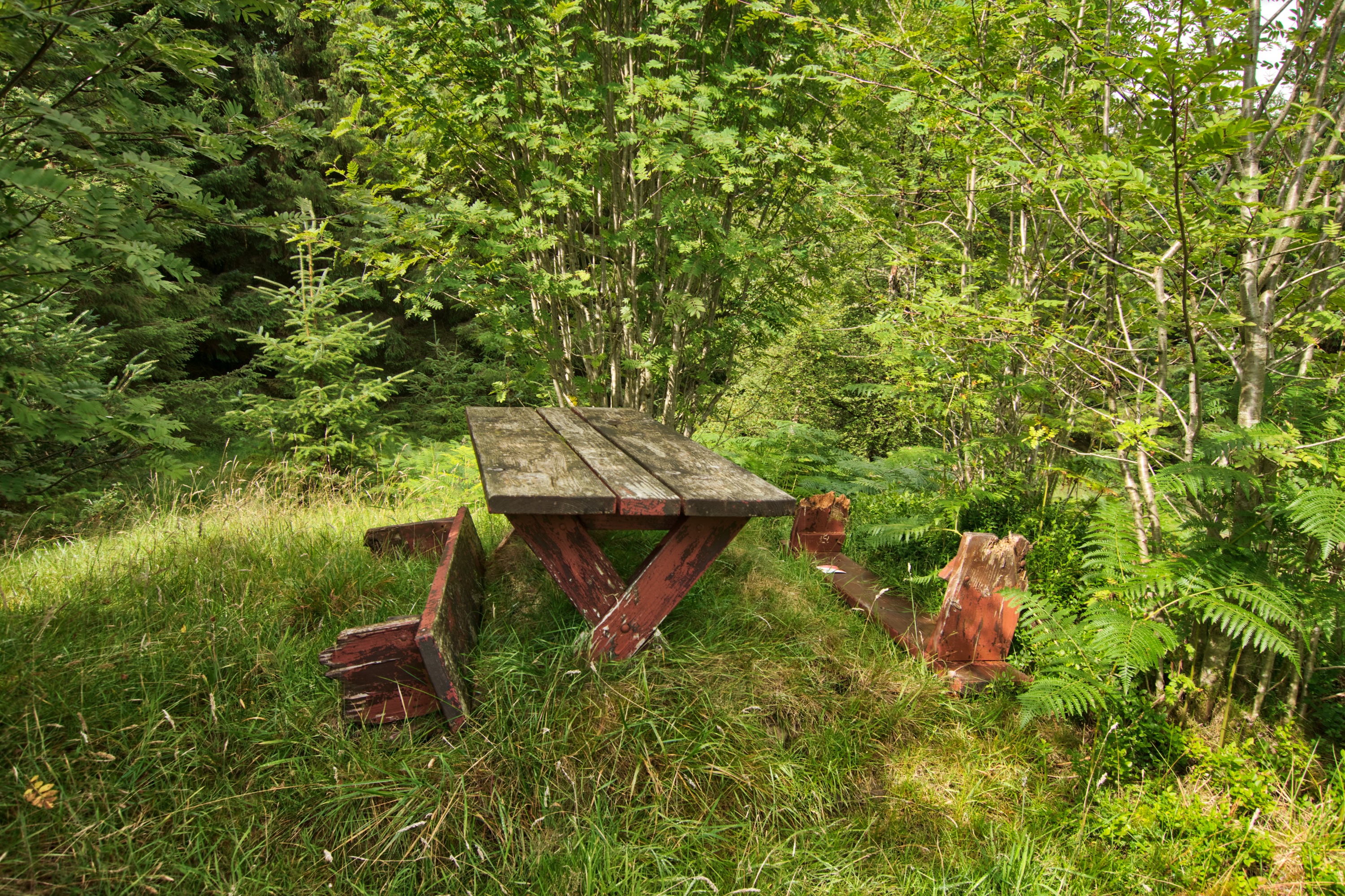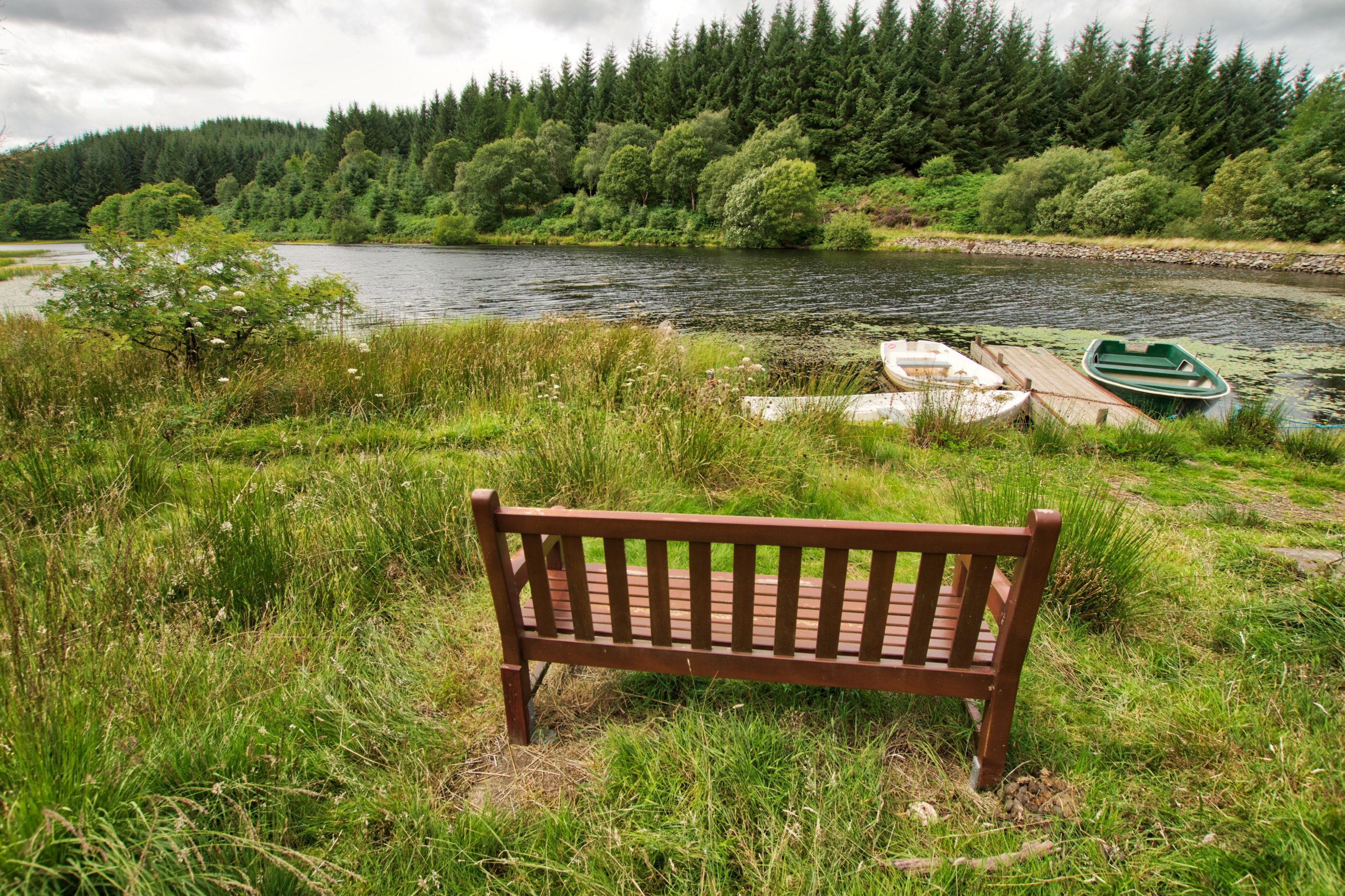 Also sind wir noch ein Stückchen weiter auf dem Forest Track bis zum anderen Ende des Lochans gelaufen. Wir hatten Glück, denn dort stand eine Fischerhütte und daneben eine schöne Bank mit Blick auf das Lochan. Dort haben wir unsere Mittagspause gemacht. Dieses Mal gab es kein warmes Mittagessen, sondern Sandwiches und Nudelsalat von Co-op. Aber da wir meine Thermoskanne nicht brauchten um warmes Wasser für den Barocook zu transportieren, gab es stattdessen eine Tasse Kaffee. Während wir unsere Pause machten, habe ich die Karte studiert. Von hier aus sollte es weiter laut Wanderführer durch ein Waldstück gehen und man sollte nur gelegentlich einen Blick auf das größere Loch Venachar erhaschen können. Man hätte aber auch vom Rob Roy Way abweichen und am Ufer des Loch Venachar lang laufen können. Allerdings wäre man dann wieder auf einer kleinen Straße gelaufen. Katharina war dagegen und so haben wir unsere Wanderung nach der Pause wie vorgesehen auf dem Forest Track fortgesetzt.