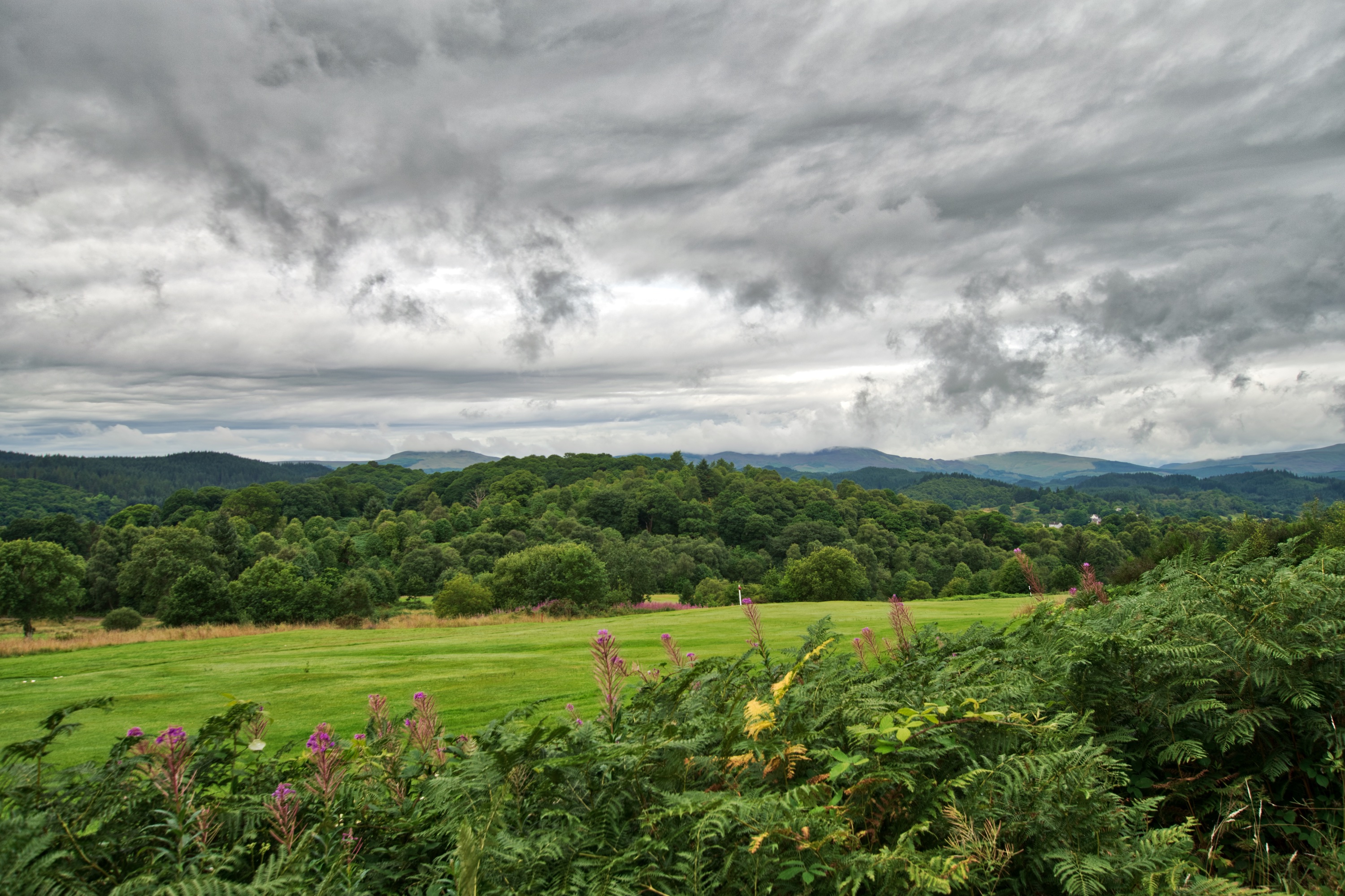 Rechts kam bald der Golfplatz von Aberfoyle in Sicht. Der Himmel war wolkenverhangen und es nieselte.