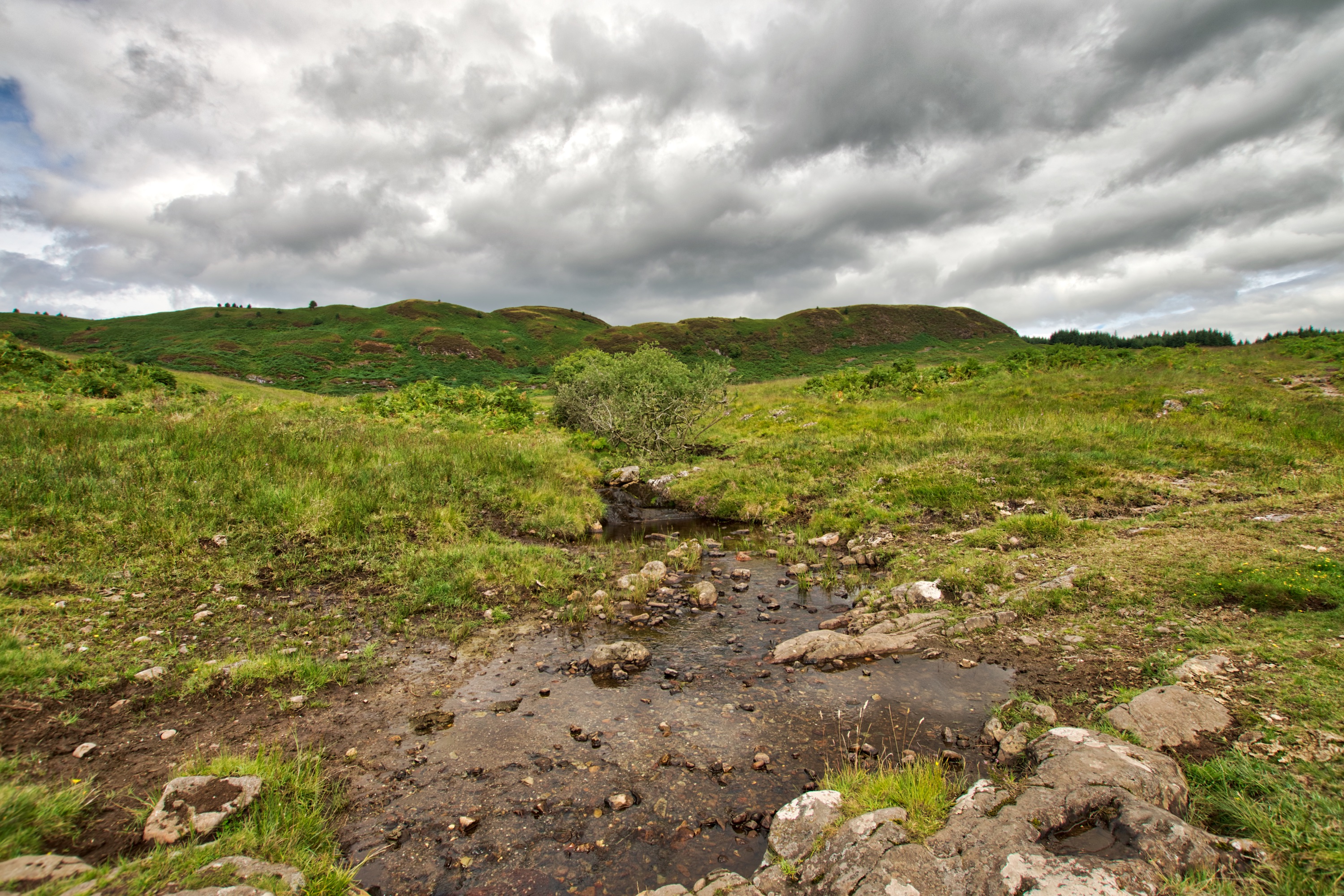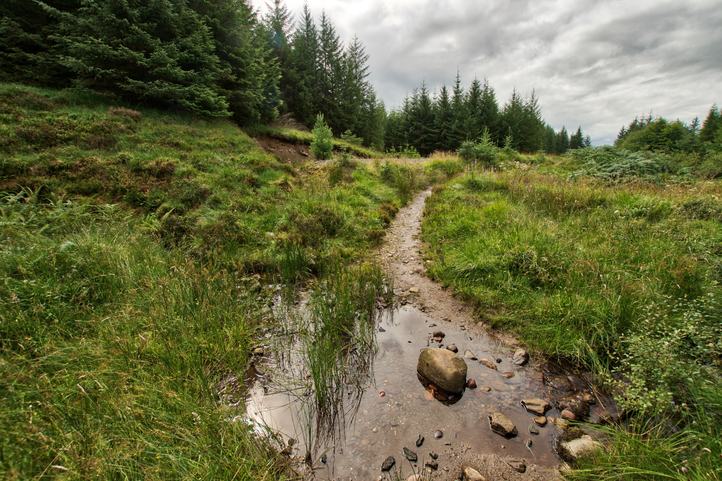 Nach etwa fünf Kilometern endete die breite Schotterstraße und der Weg ging in einen kleinen Trampelpfad über. Auf der Karte warten mehrere Furten eingezeichnete, an denen Bach- bzw. Flussläufe überquert werden sollten und wir hatten uns schon auf Flussüberquerungen wie im letzten Jahr in Glen Banchor eingestellt. Die erste Furt war dann allerdings mehr eine Pfütze.