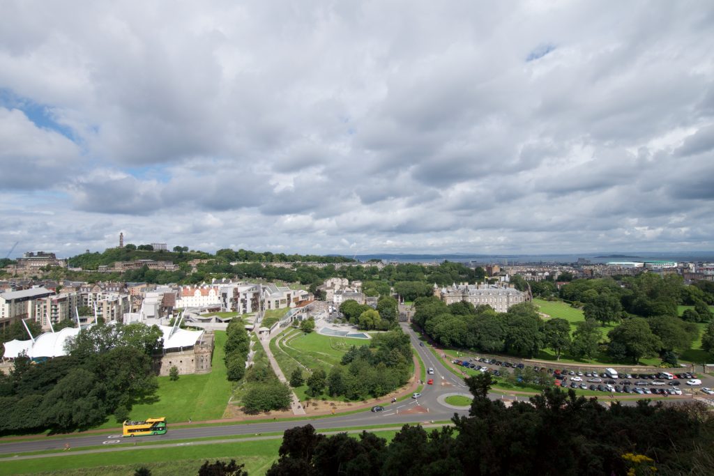 Blick Richtung Palace of Holyrioodhouse (Bildmitte, rechts) und Scottish Parliament (Bildmitte, links)