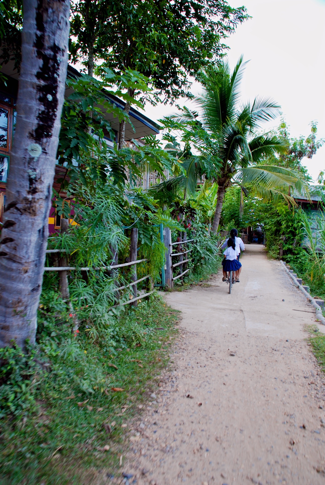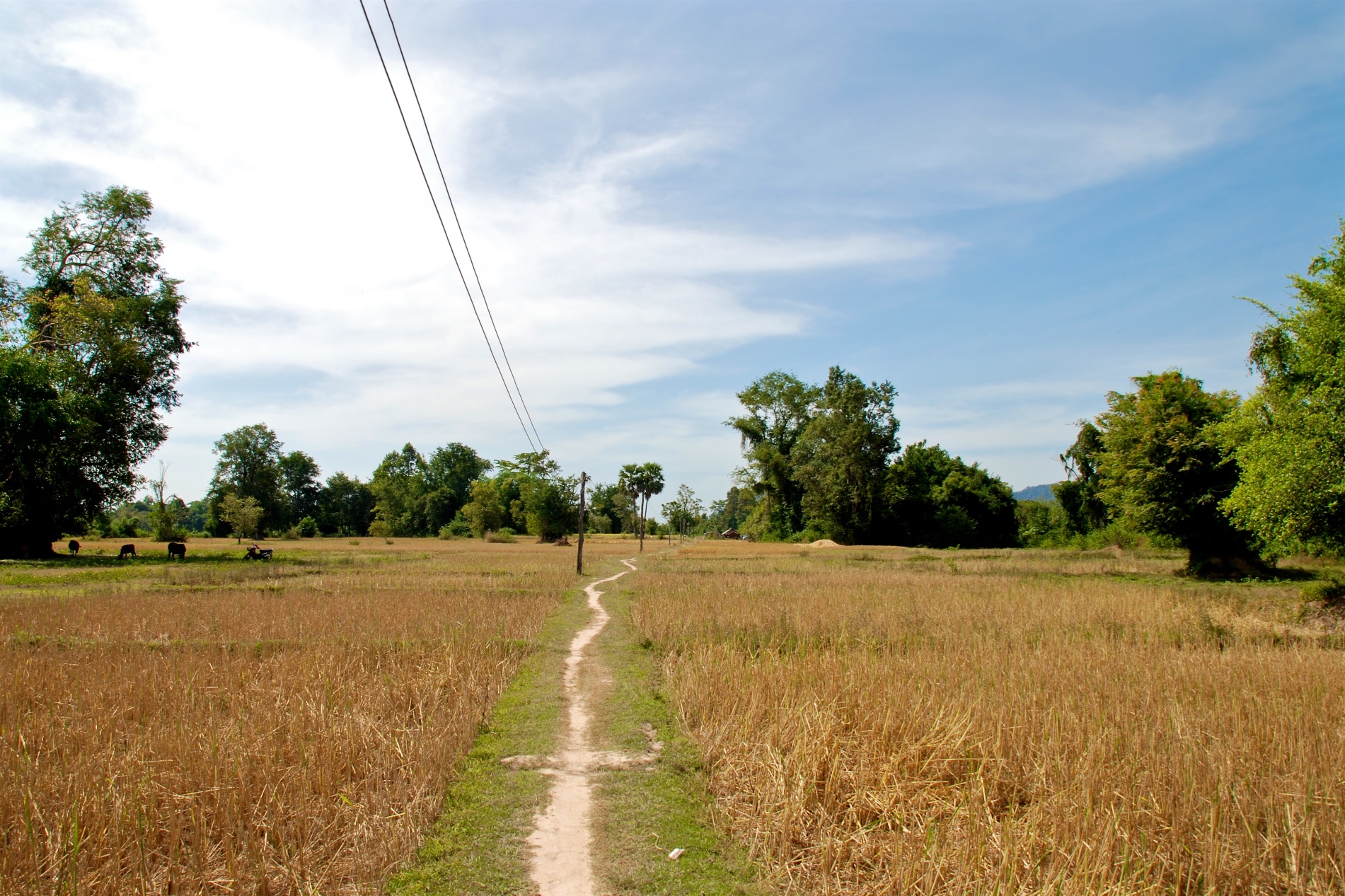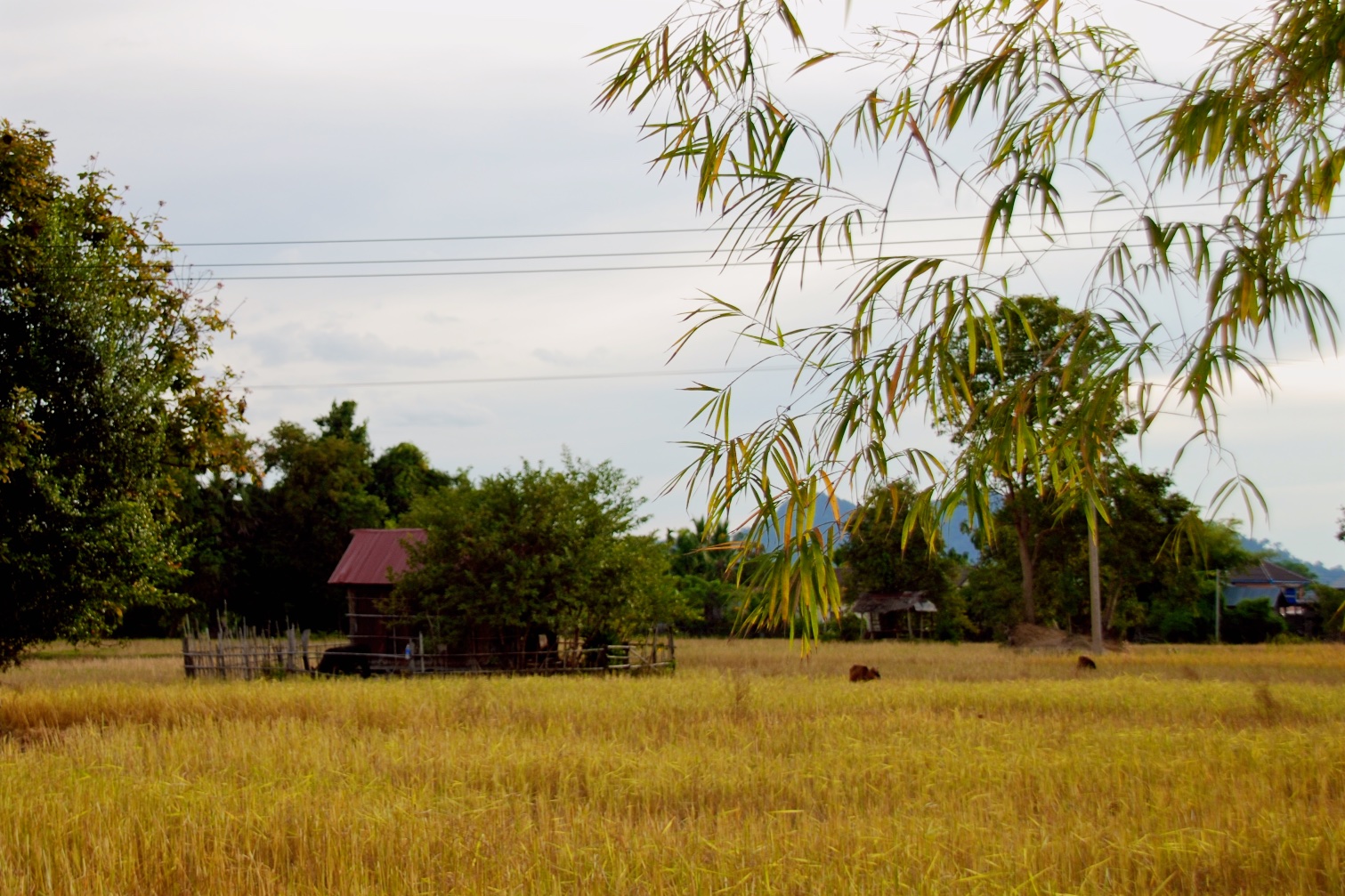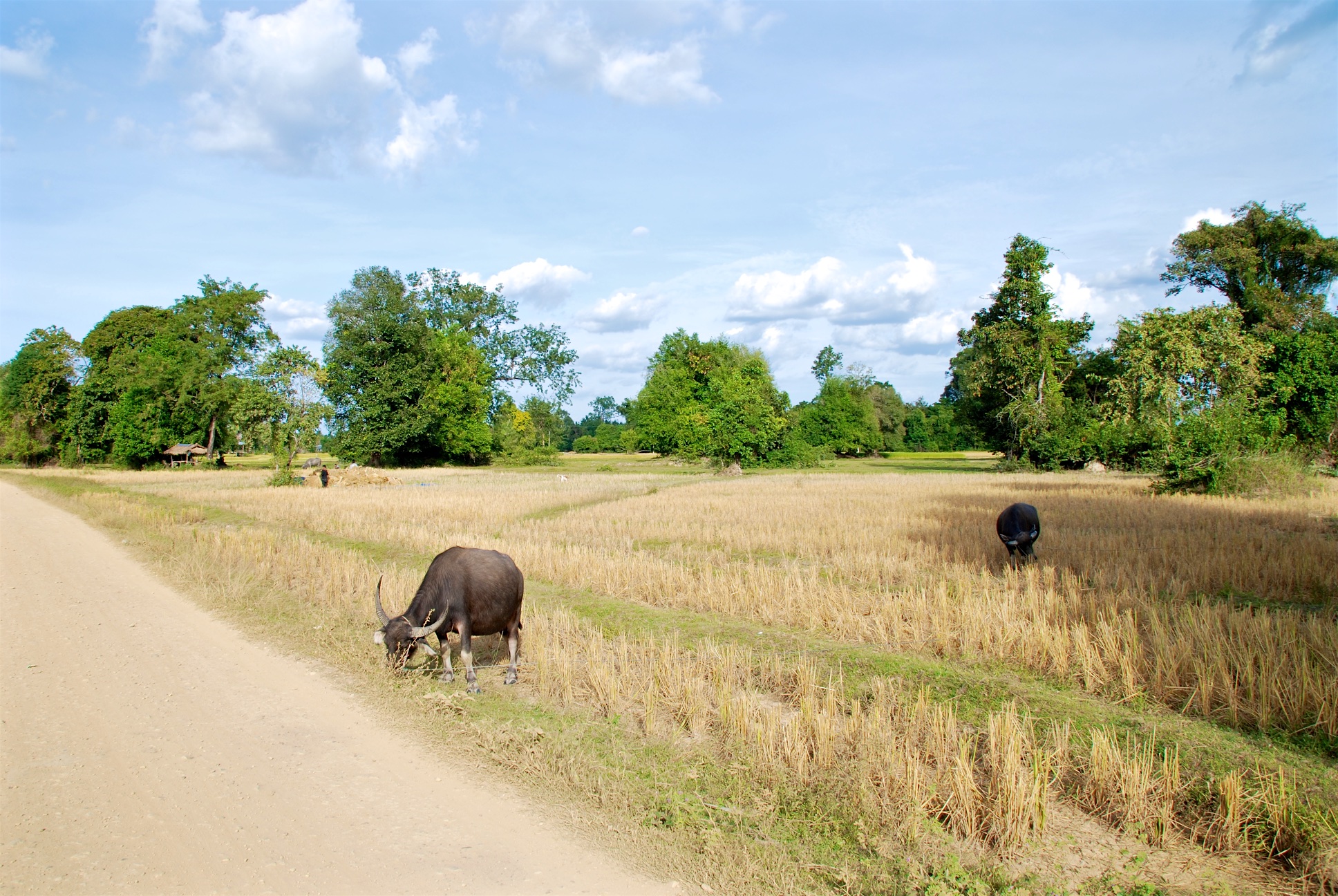 Gegen halb drei bin ich dann wieder losgeradelt, um die Insel weiter zu erkunden. Der Weg war sehr schmal und führte am Ufer entlang vorbei an den Reisfeldern im Inneren der Insel. Alle paar Meter kam ein Haus, überall liefen Hühner herum und auch um einige grasende Wasserbüffel musste ich herumfahren. Irgendwann wurde der Weg dann aber noch schmaler und steinig dazu. Außerdem wurden die Abstände zwischen den Häusern immer größer. Da ich keine Karte hatte, bin ich dann umgekehrt und wieder nach Don Det hinüber geradelt.