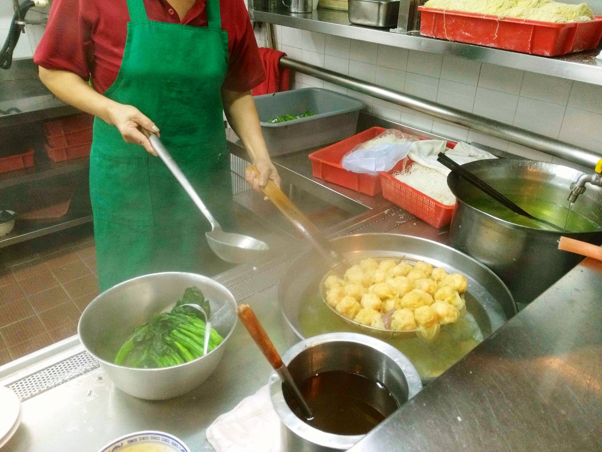 Der erste Stopp unserer Food Tour war „Tsim Chai Kee Noodle“ (153 Queen’s Road Central). Dort haben wir Nudelsuppe mit Wontons probiert und konnten an der offenen Küche der Zubereitung der Wontons zusehen. Die Karte bei „Tsim Chai Kee Noodle“ ist sehr begrenzt, aber das ist eher ein Vorteil als ein Nachteil – das Wenige, was auf der Karte steht, ist herausragend. Und günstig: ein Nudelsuppe mit Wontons oder Fischbällchen kostet umgerechnet nur ca. 3,10 €. So sehen es auch die Tester von Michelin, die dem Restaurant an seinem zweiten Standort in der Wellington Street zwar keinen Stern, aber immerhin die Auszeichnung „Bib Gourmand“ gegeben haben – eine Auszeichnung für Restaurants, die sorgfältig zubereitete und preiswerte Mahlzeiten anbieten.