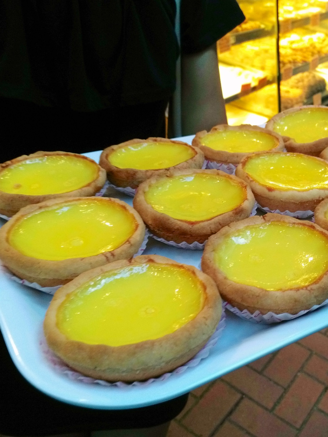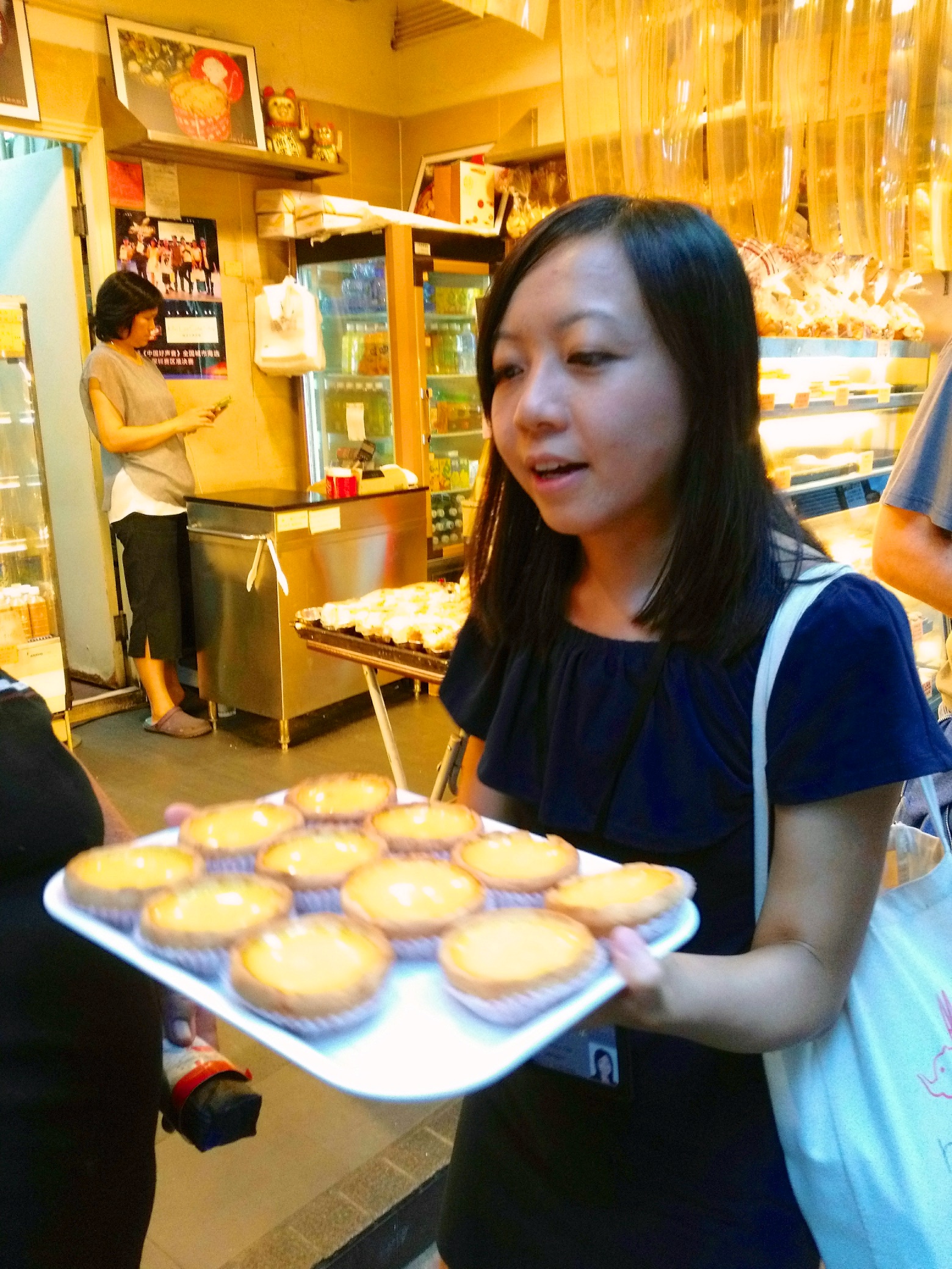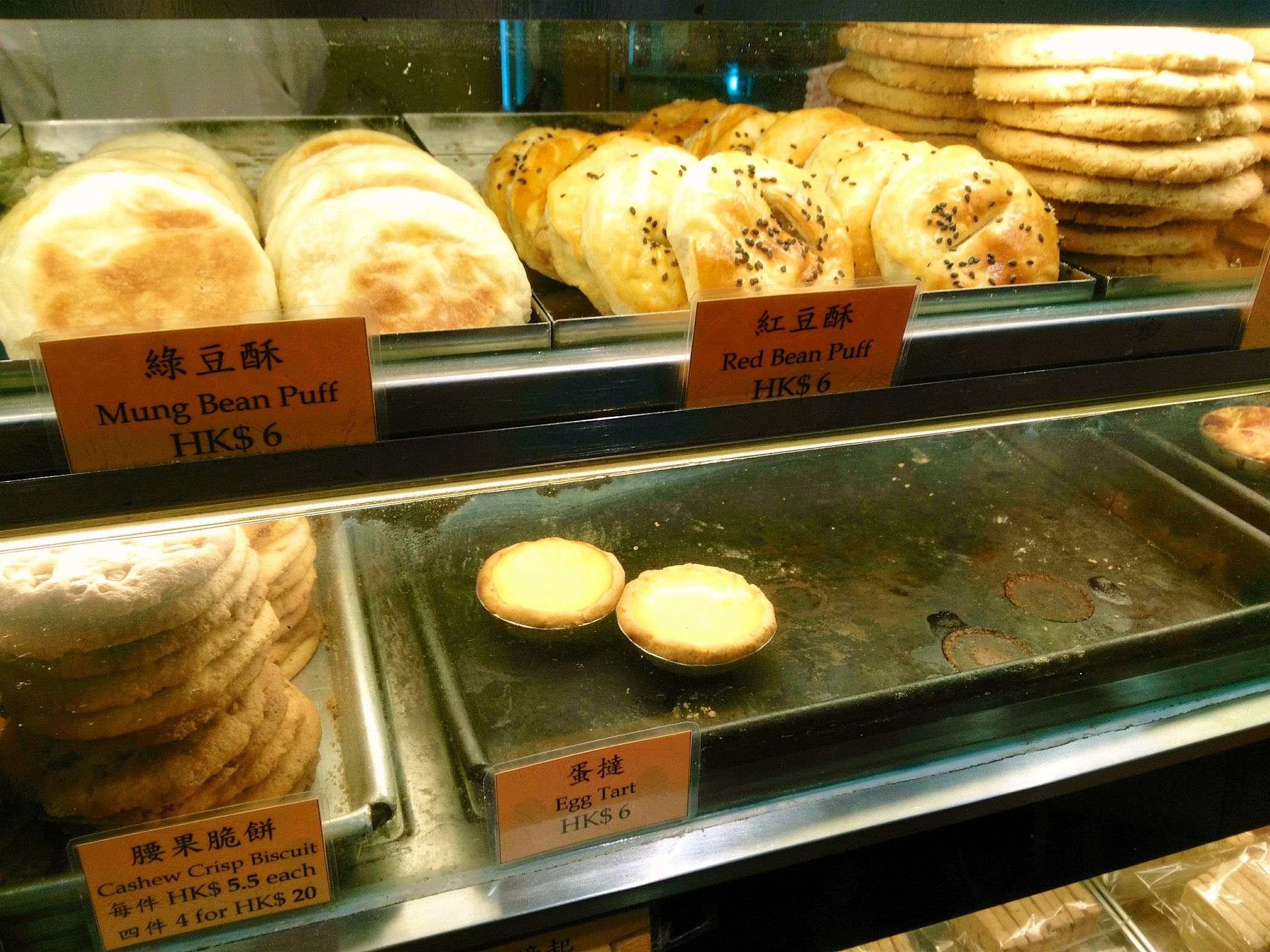 Den krönenden Abschluss der Food Tour bildete ein Besuch bei „Hei Lee Cake Shop“ (3 Hillier Street). Dort gab es für uns Egg Tarts, Blätterteigpasteten mit Puddingfüllung, zu probieren. Die Egg Tarts kamen ursprünglich mit den Portugiesen nach Macau und dann von dort nach Hongkong. Während die Egg Tarts in Macau ein etwas karamellisierteres Aussehen haben, ähneln die Egg Tarts in Hongkong eher glänzenden britischen Custard Tarts. Lecker sind sie aber beide!