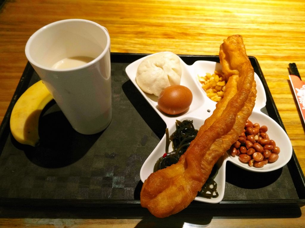 An meinem ersten vollen Tag in Wuyishan bin ich mit einem chinesischen Frühstück in den Tag gestartet. Auf die Reissuppe und die dazugehörigen Beilagen habe ich verzichtet, aber der Rest war okay. Insbesondere die lange, frittierte Teigstange (Youtiao) schmeckte sehr gut – noch besser, wenn man sie in den Milchtee tunkte. Aber auch der herzhafte Knödel (Baozi), gefüllt mit Fleisch, war lecker. Das Ei und die Banane hätte man natürlich auch in Deutschland beim Frühstück finden können.