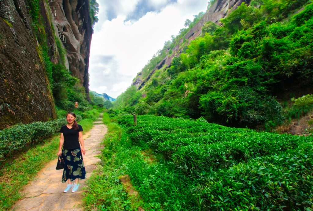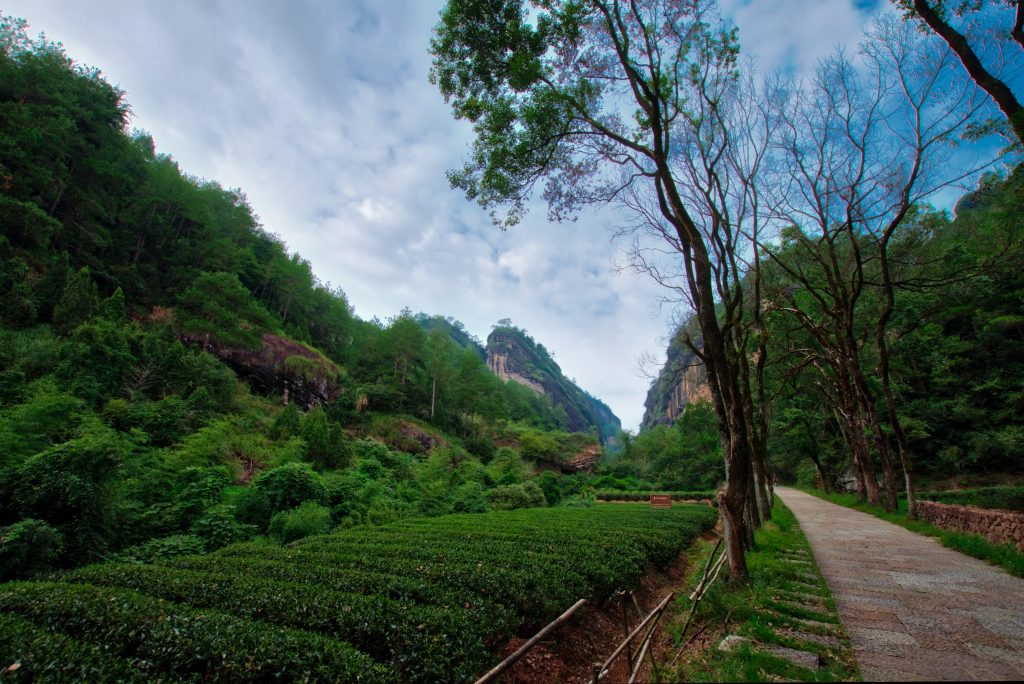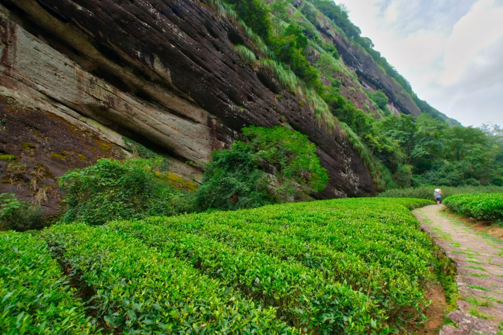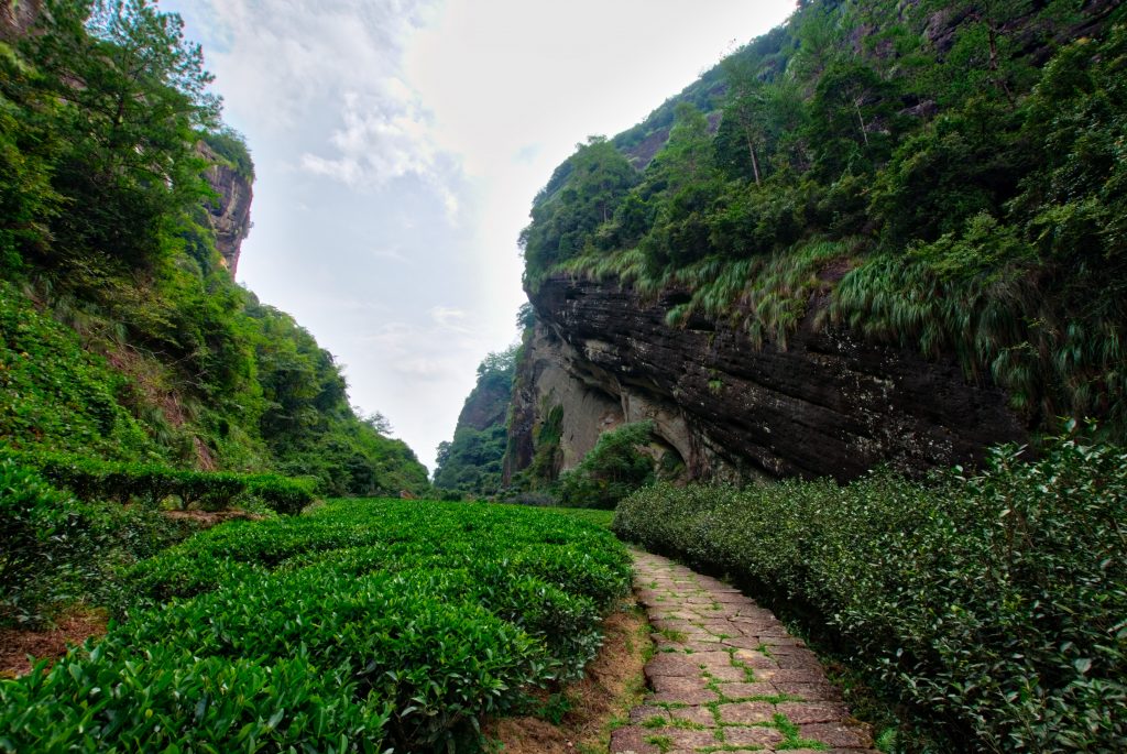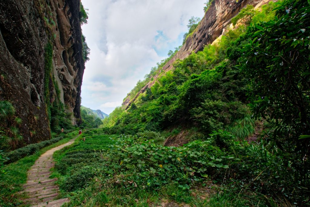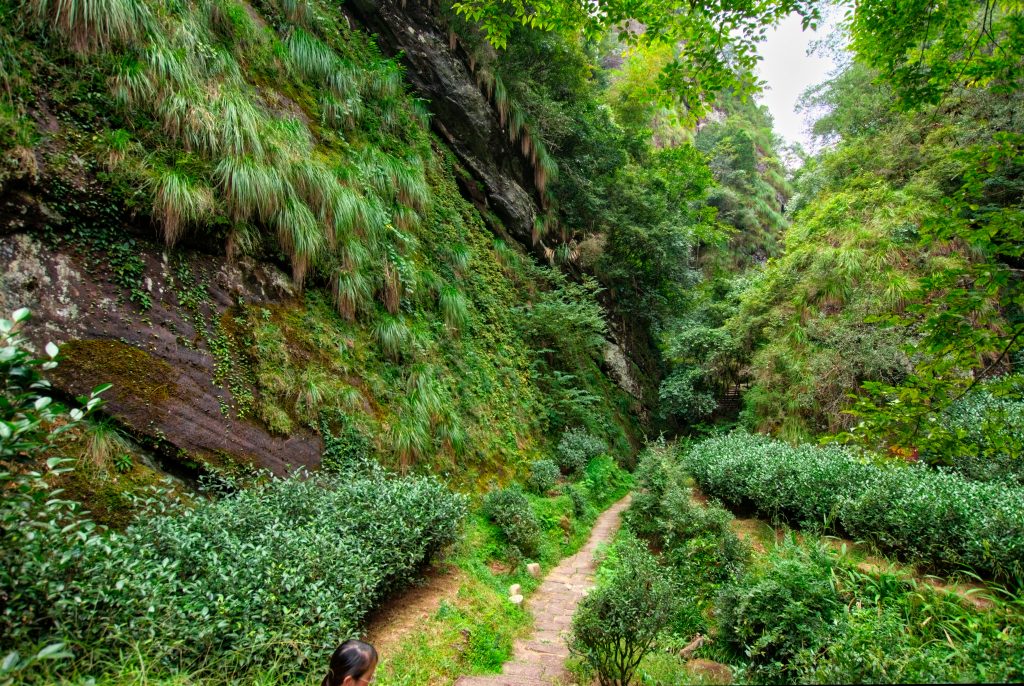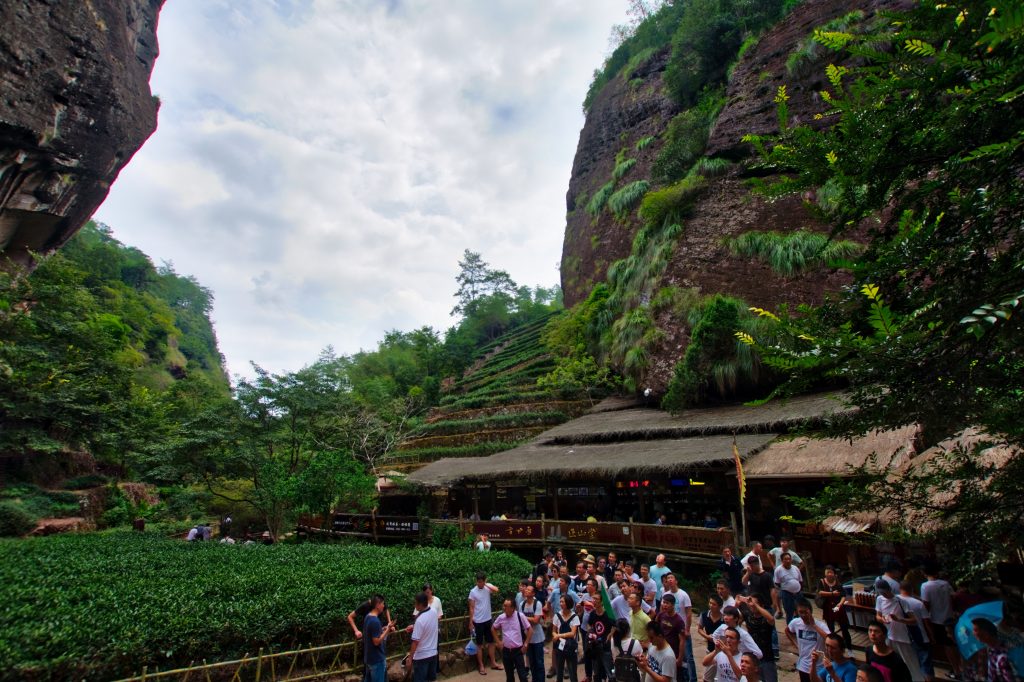 Was aber geblieben ist, ist der Teeanbau im Tal. Hier wird der sogenannte Dahongpao-Tee angebaut. Dà hóng páo heißt ‚große rote Robe‘. Seinen Namen erhielt der Tee der Legende zufolge dadurch, dass die Mutter eines Kaisers der Ming-Dynastie durch einen bestimmten Tee von einer Krankheit geheilt wurde, und der Kaiser aus Dankbarkeit große rote Gewänder um die vier Büsche, von denen dieser Tee stammte, legte. Eine andere Legende besagt, dass ein junger Mann, der vor einer Beamtenprüfung stand, in einem Kloster durch einen Tee kuriert wurde, an der Prüfung teilnehmen konnte und ein ausgezeichnetes Prüfungsergebnis erzielte. Als hoher Beamter kehrte er zum Kloster zurück, ließ sich die Teepflanze zeigen und legte ihr seine vom Kaiser geschenkte rote Robe um.