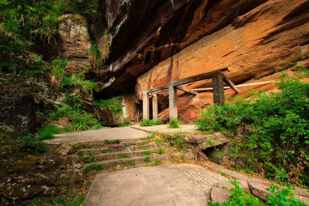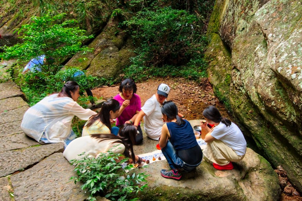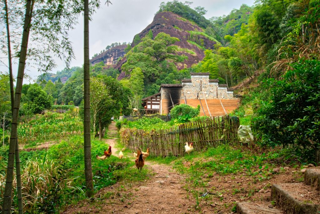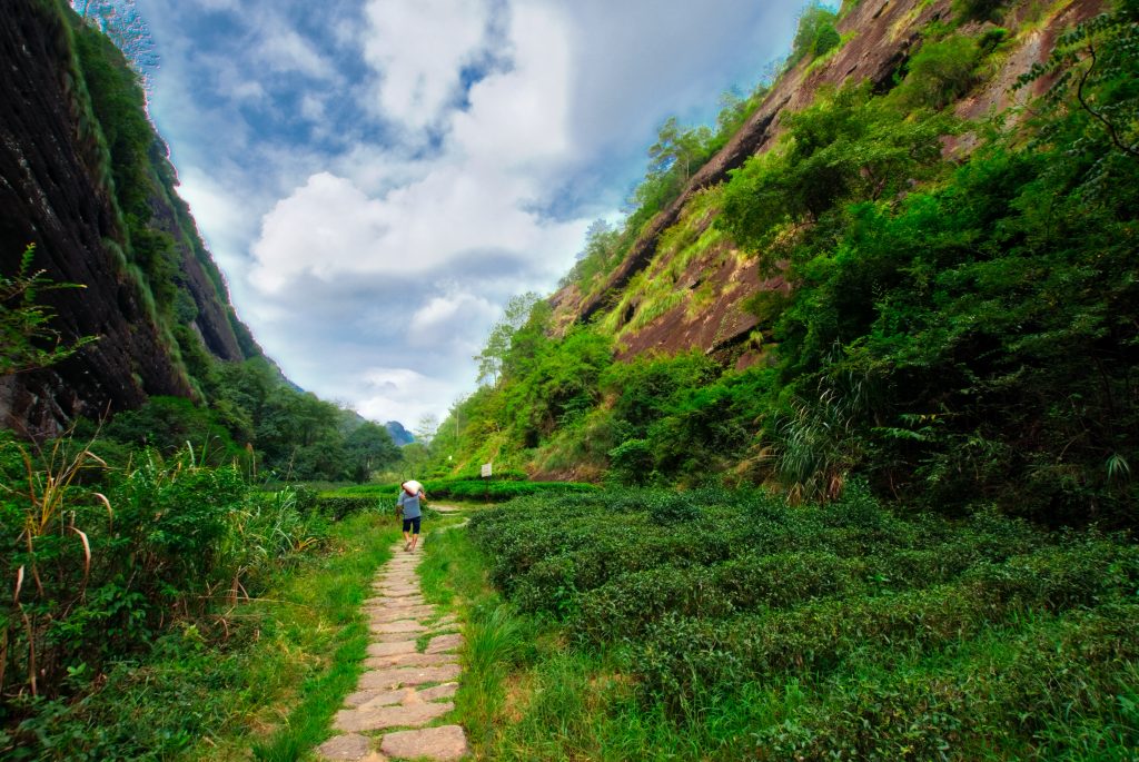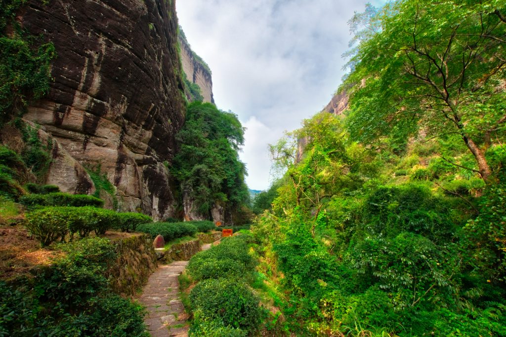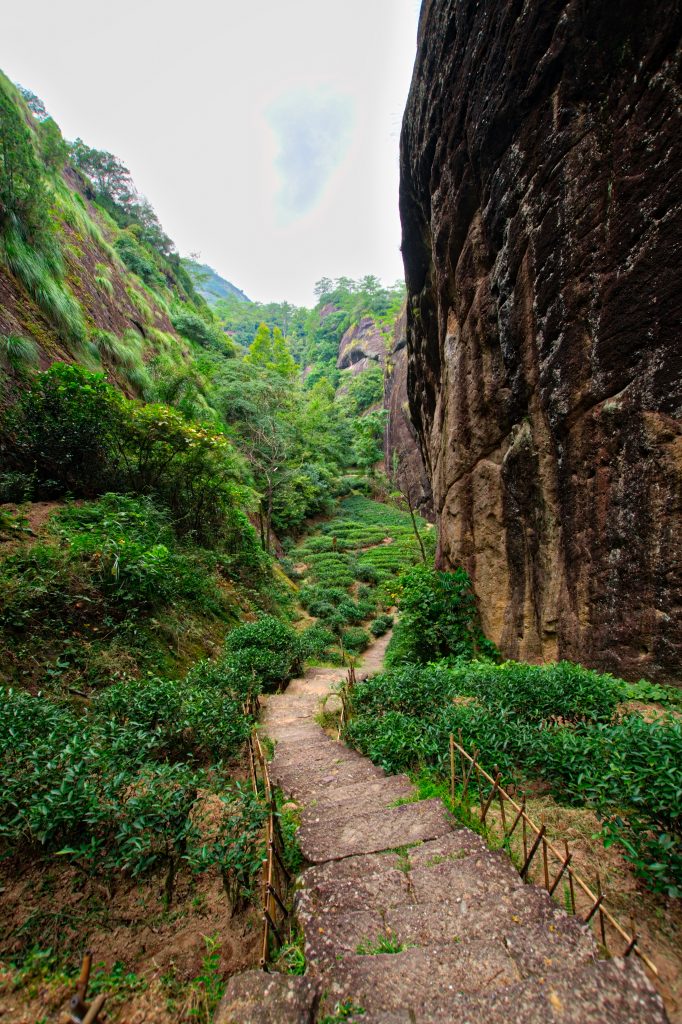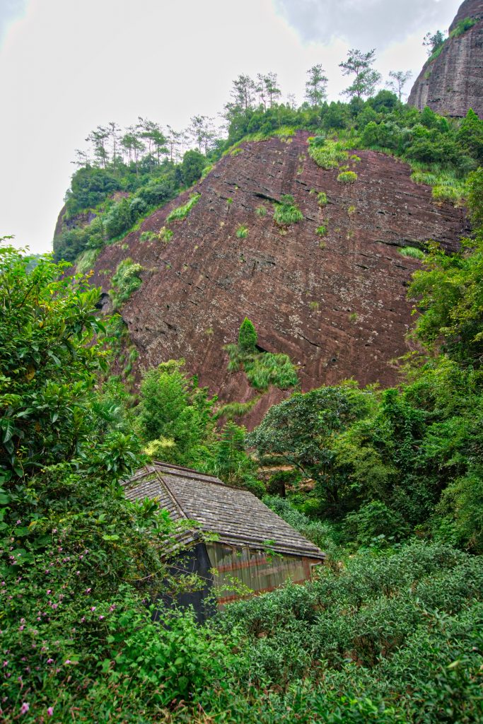 Was aber geblieben ist, ist der Teeanbau im Tal. Hier wird der sogenannte Dahongpao-Tee angebaut. Dà hóng páo heißt ‚große rote Robe‘. Seinen Namen erhielt der Tee der Legende zufolge dadurch, dass die Mutter eines Kaisers der Ming-Dynastie durch einen bestimmten Tee von einer Krankheit geheilt wurde, und der Kaiser aus Dankbarkeit große rote Gewänder um die vier Büsche, von denen dieser Tee stammte, legte. Eine andere Legende besagt, dass ein junger Mann, der vor einer Beamtenprüfung stand, in einem Kloster durch einen Tee kuriert wurde, an der Prüfung teilnehmen konnte und ein ausgezeichnetes Prüfungsergebnis erzielte. Als hoher Beamter kehrte er zum Kloster zurück, ließ sich die Teepflanze zeigen und legte ihr seine vom Kaiser geschenkte rote Robe um.