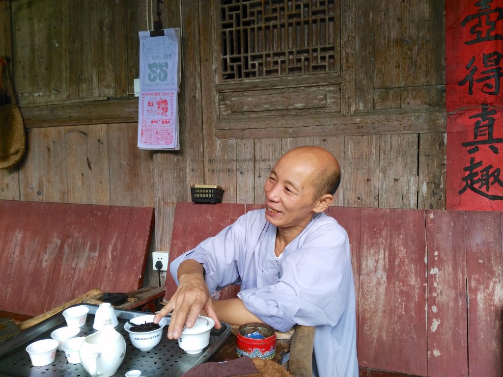 Nachdem wir eine Weile gelaufen waren, kamen wir zu einem kleinen Tempel. Jenny kannte den dortigen Mönch und er lud uns zum Teetrinken ein. Die losen Teeblätter werden in einer kleinen Schale mit heißem Wasser aufgegossen. Der erste Aufguss wird sofort weggeschüttet oder benutzt, um die Teeschälchen zu säubern. Erst der zweite Aufguss wird getrunken. Die Teeschälchen sind winzig, aber der Tee wurde immer wieder aufgegossen und mein Schälchen wurde ein übers andere Mal mit Tee gefüllt. Trotz oder gerade bei der Hitze in Wuyishan sehr erfrischend.