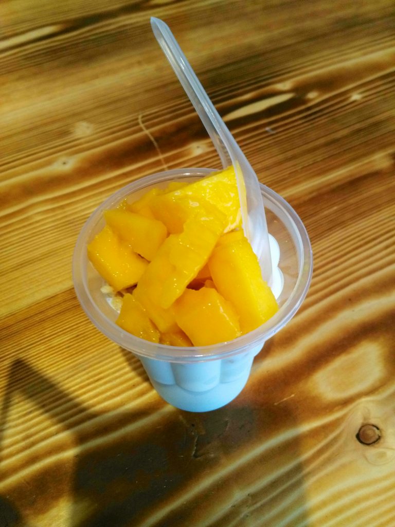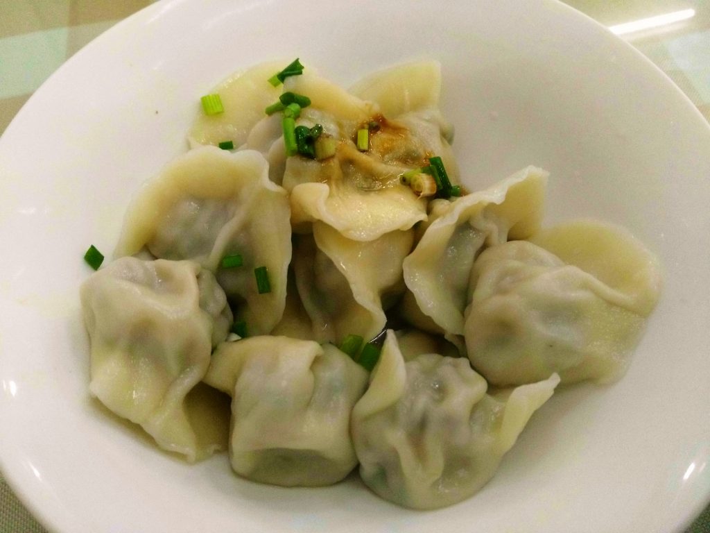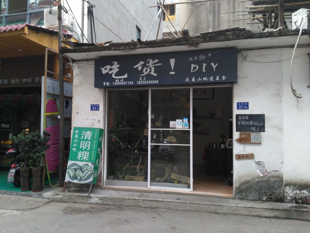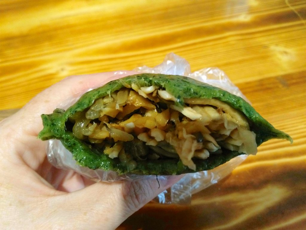 Am Ende der Floßfahrt hat Jenny mich eingesammelt und mich wieder in die Stadt gefahren. Dort habe ich mich erst eine Stunde im Hotel ausgeruht und dann habe ich mich wieder mit Jenny getroffen. Wir haben einen kleine Spaziergang durch Wuyishan gemacht und Jenny hat mir einen kleinen Laden gezeigt, wo es eine lokale Spezialität gab – kleine grüne Teigtaschen mit einer Füllung aus Pilzen und anderem Gemüse. Sehr lecker! Auch sehr lecker war der hausgemachte Joghurt mit Mango, den es in dem Laden noch gab.