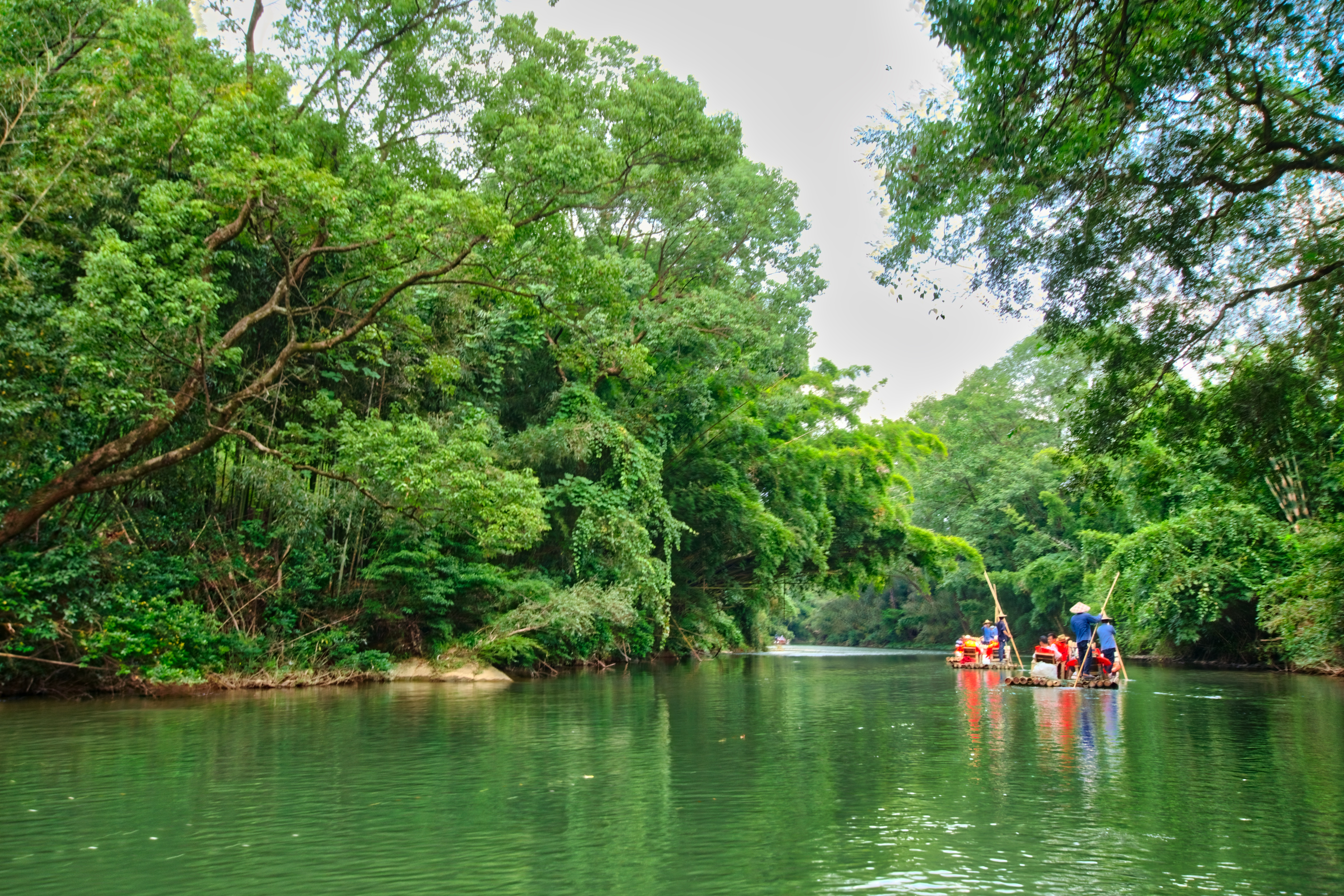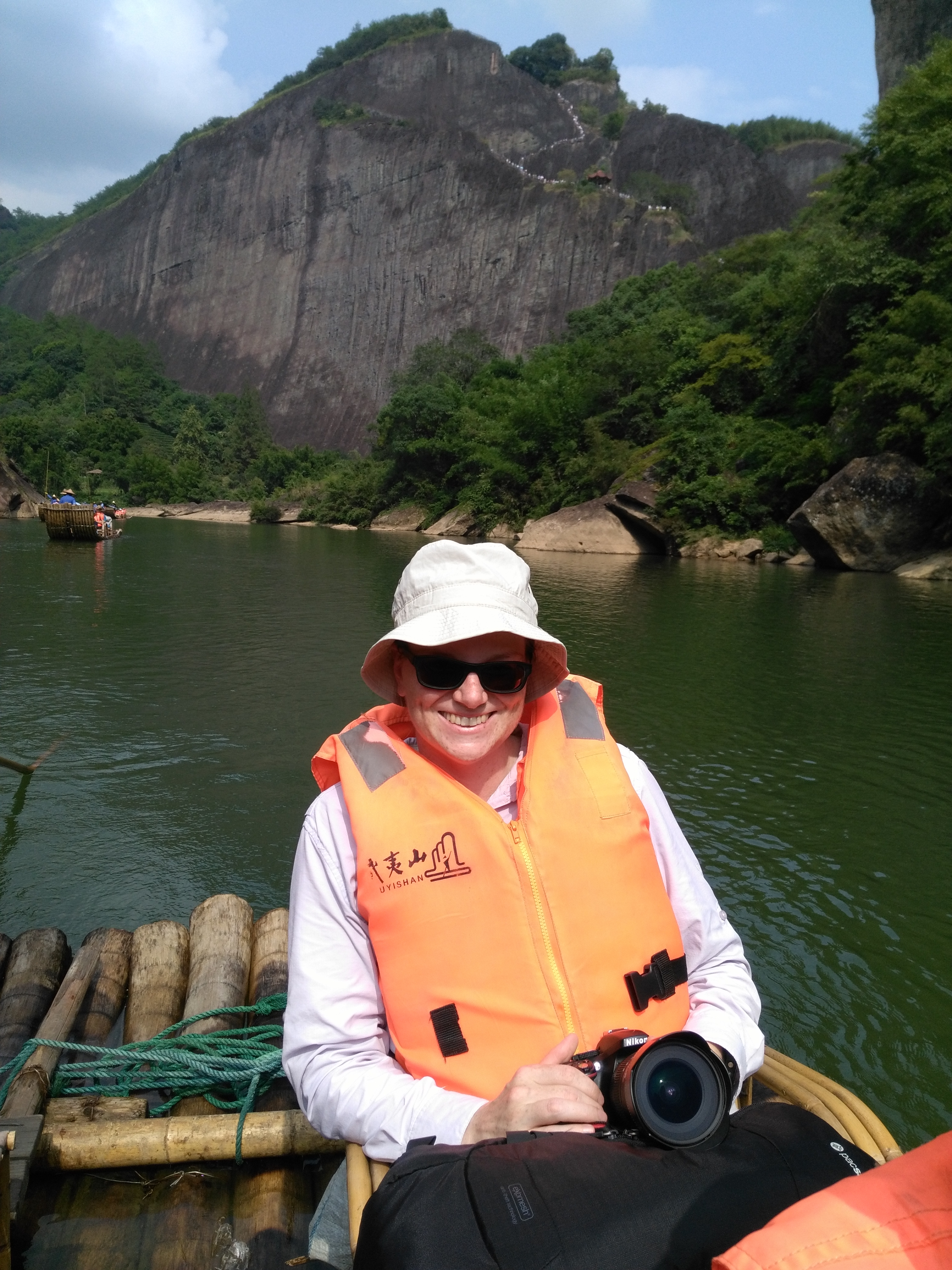 Die Floßfahrt als solche war sehr schön. Zwar sind mit uns gleich Dutzende weitere Flöße gestartet und wir sind in einer Art Kolonne den Fluß hinunter gefahren, aber das hat dem tollen Erlebnis keinen Abbruch getan. Ich habe natürlich nichts verstanden von den Erläuterungen, welche die Floßführer gegeben haben, aber das war auch nicht nötig. Ich war ganz zufrieden damit, die Szenerie zu betrachten und Fotos zu machen. Die Fahrt dauerte ca. 100 Minuten und nach einer Weile wurde ich in der Hitze ganz schön müde und wäre mehrfach fast eingeschlafen. Um der Hitze ein bisschen entgegen zu wirken, habe ich es so gemacht, wie mein chinesischer Sitznachbar: Schuhe ausziehen und Füße ins Wasser!