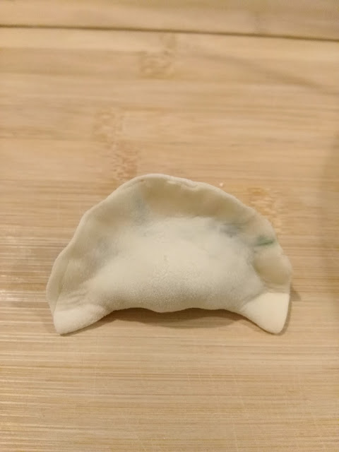 Aber das wirklich Schwierige sollte erst noch kommen: das Befüllen und insbesondere das Verschließen der Dumplings. Joyce zeigte uns, wie wir den Teig beim Verschließen des Dumplings am Rand in kleine Falten legen sollten, aber egal wie mühelos es bei Joyce aussah, von uns wollte es keinem so recht gelingen.