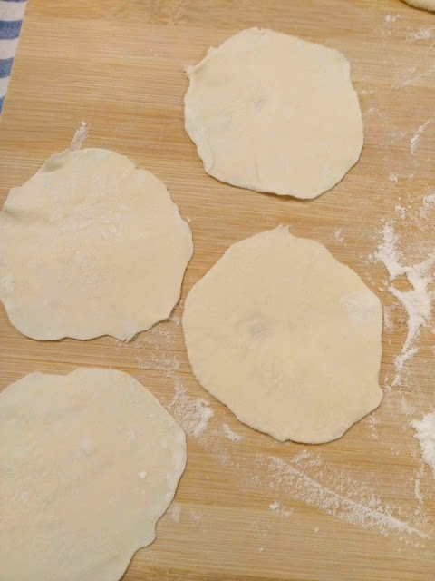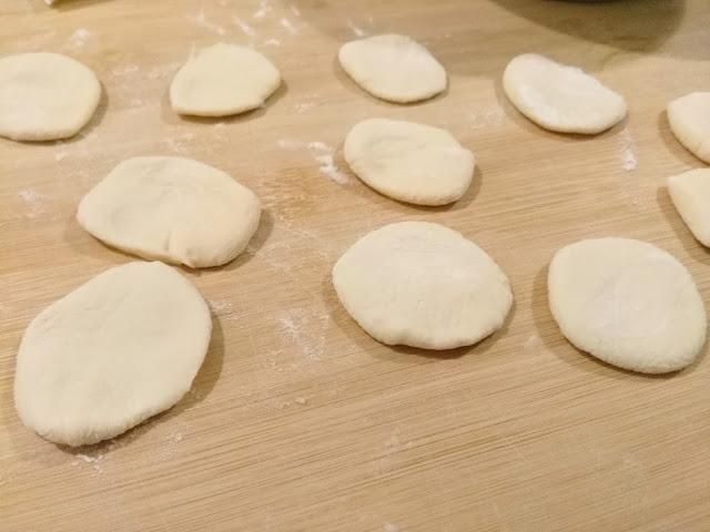 Als nächstes mussten wir unsere Teigkugel gut durchkneten und dann zeigte Joyce uns, wie wir aus der Teigkugel eine dünne Rolle und aus der Rolle kleine Teigstückchen machen sollten. Ganz wichtig war dabei, dass wir die Rolle immer um 90 Grad drehten, bevor wir das nächste Stückchen abschnitten. Die Teigstückchen wurden dann zunächst mit dem Handballen platt gedrückt und anschließend mit einem kleinen Nudelholz etwa Handteller groß rund ausgerollt. Nicht ganz einfach!