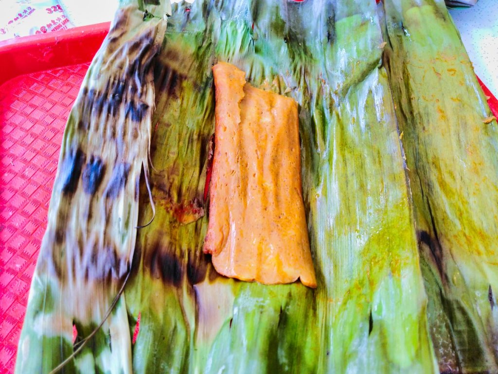 Als nächstes habe ich das Päckchen aufgemacht, in dem sich das Otah versteckte. Otah besteht aus zermanschtem Fisch, der mit Chili, Kurkuma und Currypulver gemischt wird und anschließend in ein Palmblatt eingewickelt und entweder gebraten oder gedünstet wird. Otah hat mir sehr gut geschmeckt, es hat mich seltsamerweise etwas an die Füllung von Ravioli erinnert.