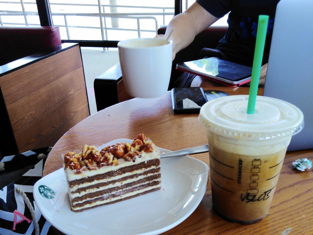 Nach dem Mittagessen bin ich weiter in Richtung East Coast Park gelaufen. Weil ich ja noch nicht genug gegessen hatte, habe ich mich dort erstmal bei Starbucks mit Kaffee und Kuchen gestärkt. In erster Linie habe ich mich aber über die Klimaanlage und den freien Internetzugang gefreut. Denn obwohl ich vom Hotel ein Handy geliehen bekommen habe, kann ich meine WhatsApp nur mit meinem eigenen Handy checken.