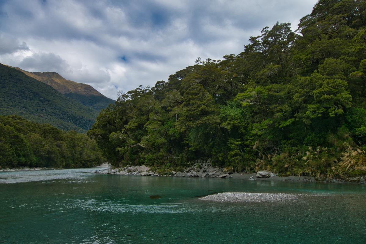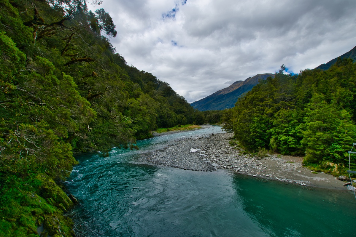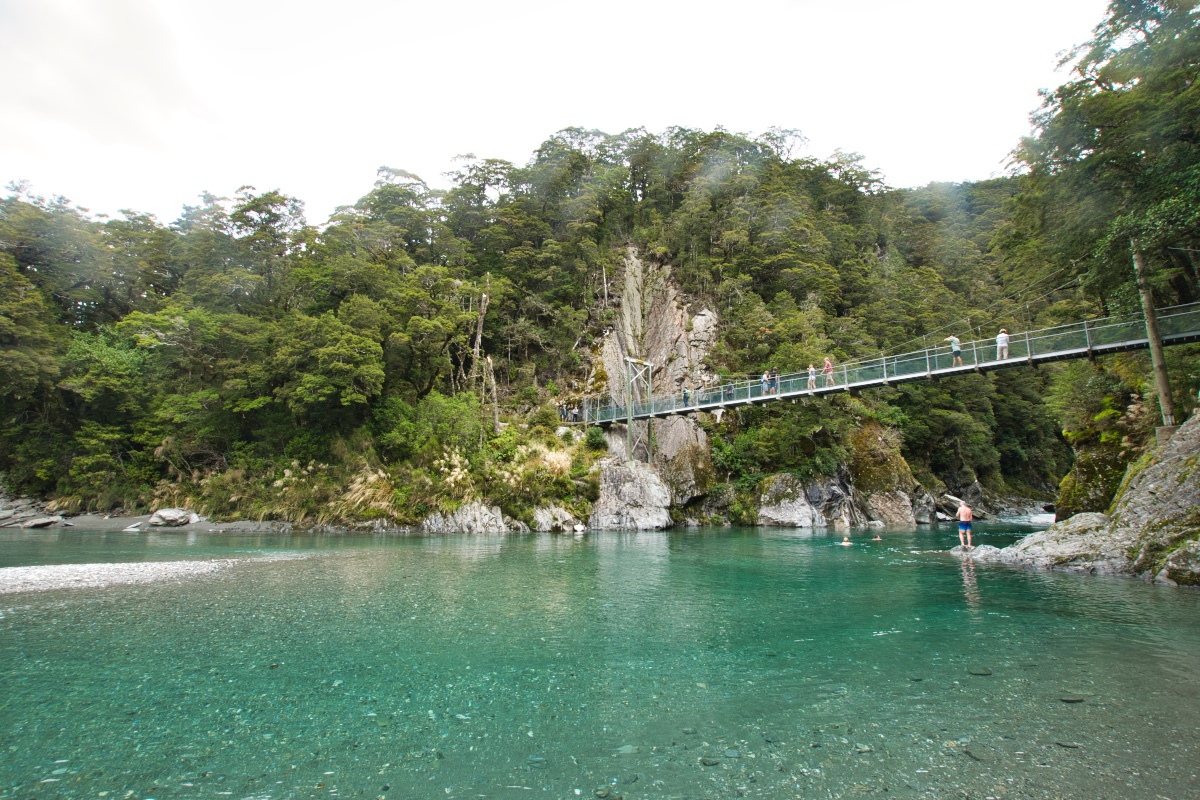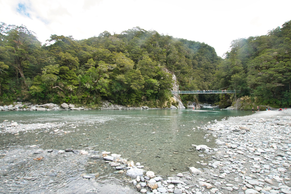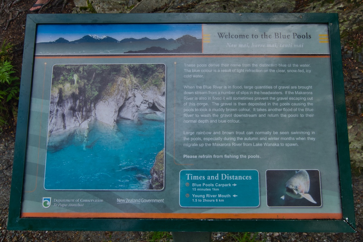 Das Highlight des Tages war dann der kurze Spaziergang zu den sogenannten Blue Pools am Makarora River. Nach einem kurzen Weg durch den Wald ging es über eine Hängebrücke auf die andere Seite des Makarora River. Auf die erste Hängebrücke folgte wenig später eine zweite über den Blue River. Die Blue Pools liegen unterhalb dieser zweiten Hängebrücke und haben ihren Namen von der türkisblauen Farbe des Wassers, die wiederum durch die Brechung des Lichts in dem klaren Gletscherwasser entsteht. Wenn der Blue River viel Wasser führt, schwemmt er eine Menge Gestein vom Oberlauf mit hinunter bis zu den Blue Pools und wenn der Makarora River ebenfalls gerade viel Wasser führt, verhindert dies teilweise das das Gestein in den Makarora River ausgeschwemmt wird. Dann sehen die Blue Pools matschig grau aus. Aber ich hatte Glück – die Blue Pools strahlten im Sonnenlicht im schönsten blau. Unterhalb der zweiten Hängebrücke kann man auch baden, aber ich hatte meine Badesachen nicht dabei und es wäre mir auch sicher zu kalt gewesen im Wasser dieses Bergbaches.