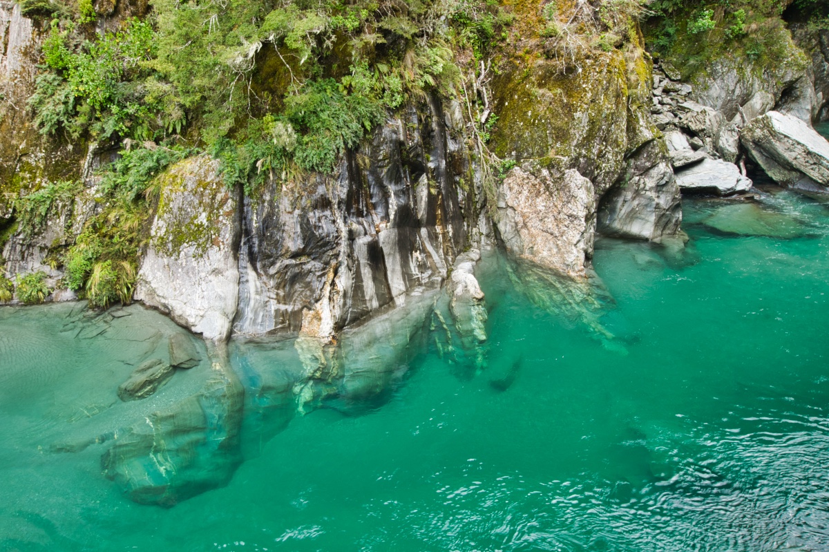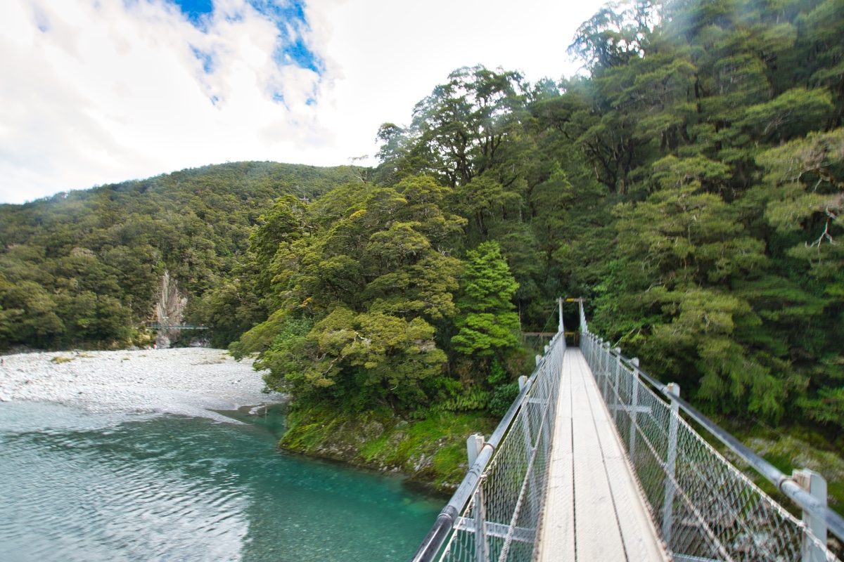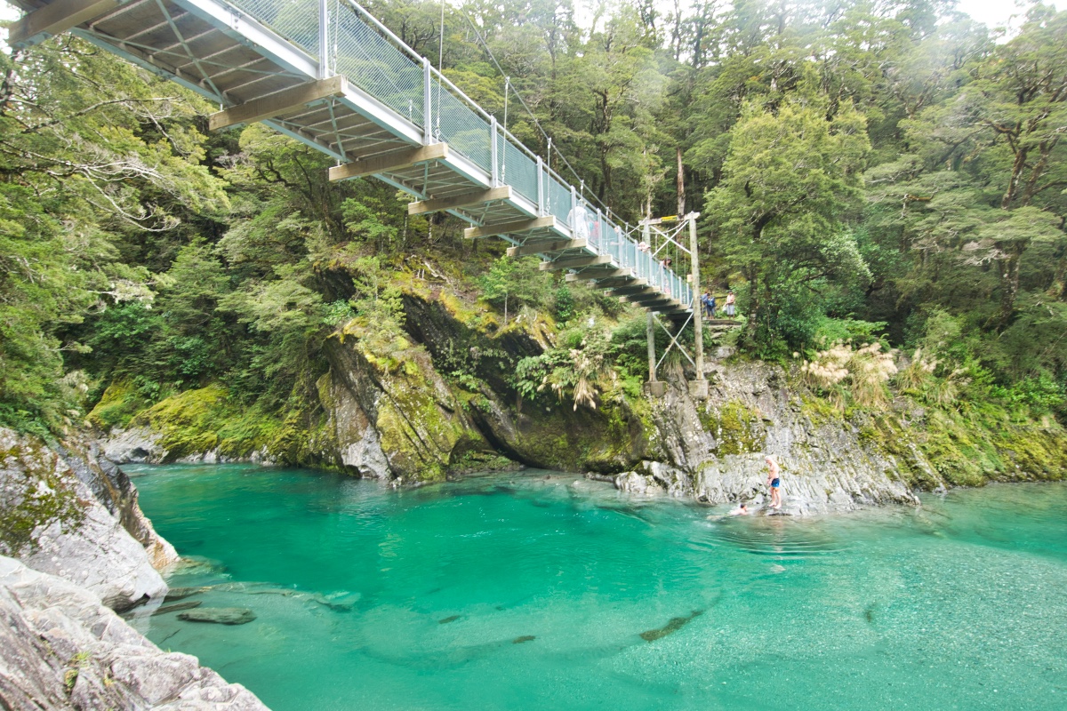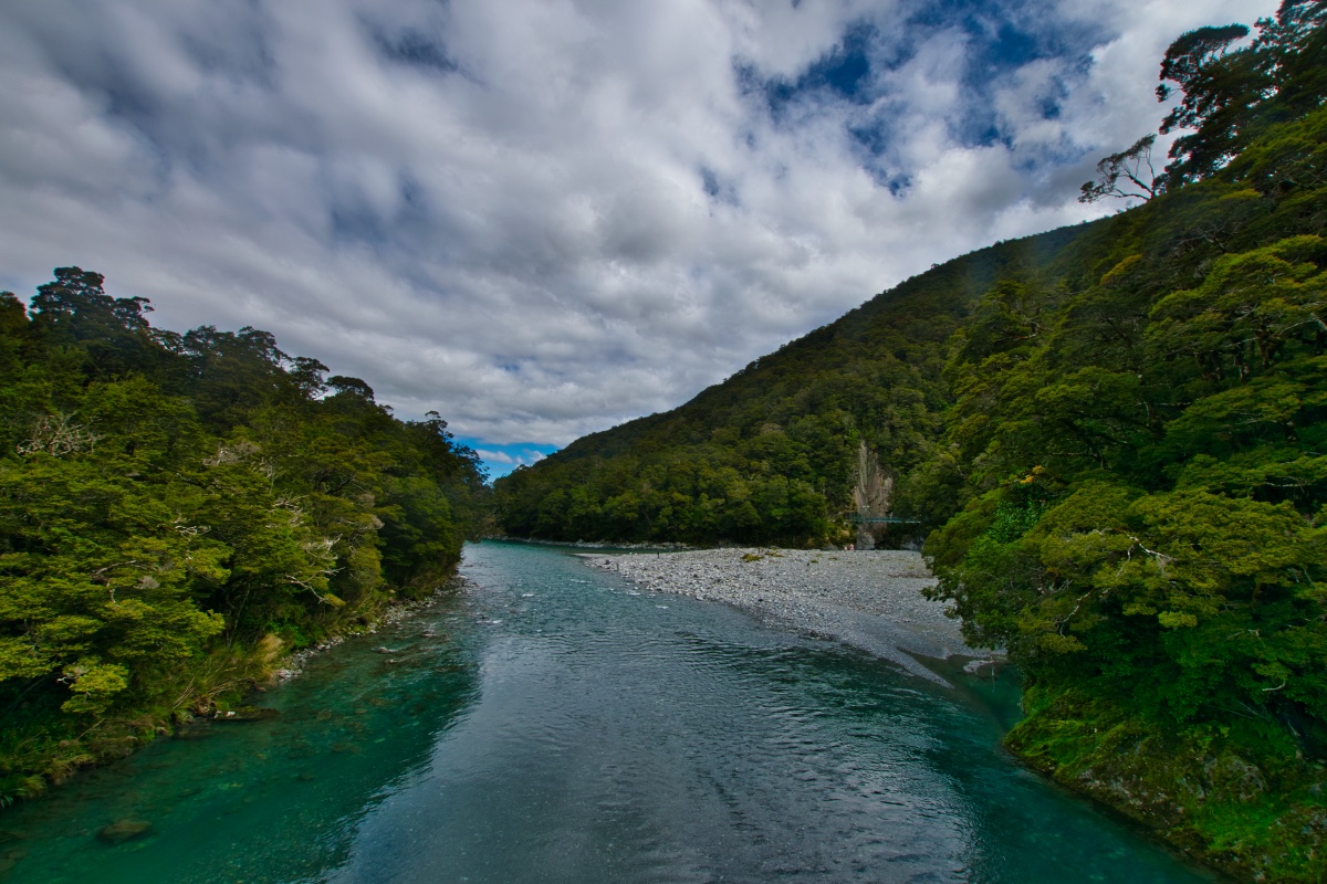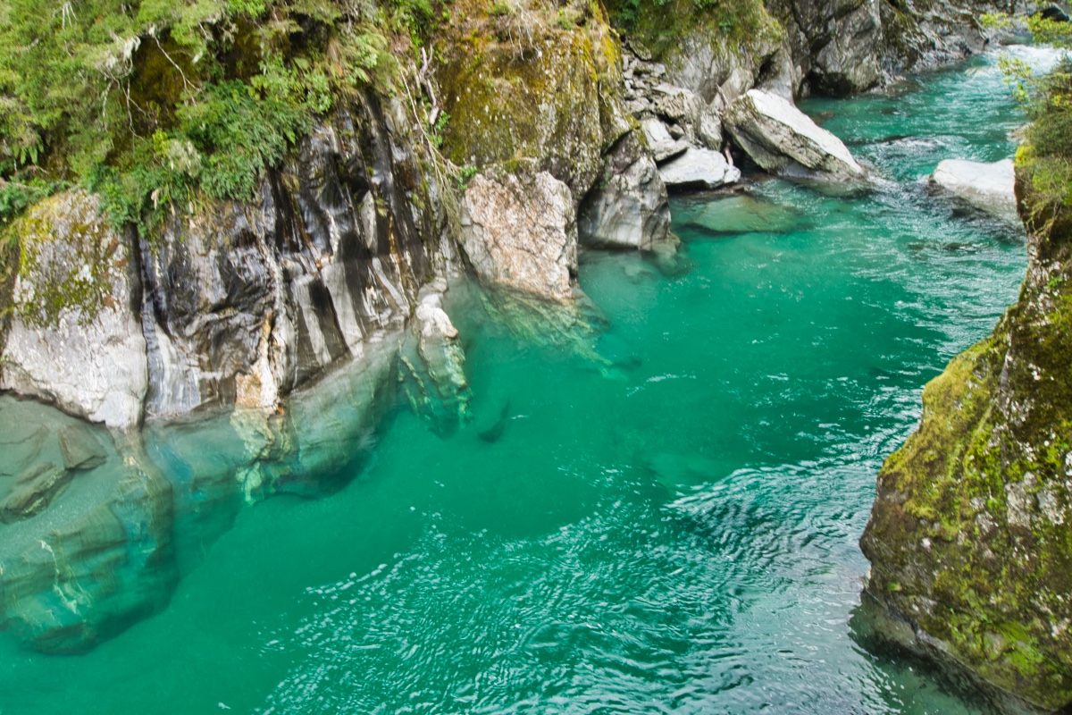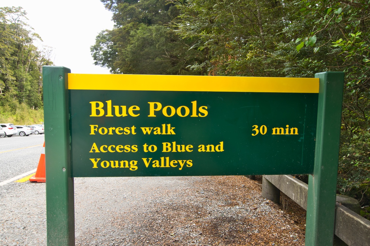 Das Highlight des Tages war dann der kurze Spaziergang zu den sogenannten Blue Pools am Makarora River. Nach einem kurzen Weg durch den Wald ging es über eine Hängebrücke auf die andere Seite des Makarora River. Auf die erste Hängebrücke folgte wenig später eine zweite über den Blue River. Die Blue Pools liegen unterhalb dieser zweiten Hängebrücke und haben ihren Namen von der türkisblauen Farbe des Wassers, die wiederum durch die Brechung des Lichts in dem klaren Gletscherwasser entsteht. Wenn der Blue River viel Wasser führt, schwemmt er eine Menge Gestein vom Oberlauf mit hinunter bis zu den Blue Pools und wenn der Makarora River ebenfalls gerade viel Wasser führt, verhindert dies teilweise das das Gestein in den Makarora River ausgeschwemmt wird. Dann sehen die Blue Pools matschig grau aus. Aber ich hatte Glück – die Blue Pools strahlten im Sonnenlicht im schönsten blau. Unterhalb der zweiten Hängebrücke kann man auch baden, aber ich hatte meine Badesachen nicht dabei und es wäre mir auch sicher zu kalt gewesen im Wasser dieses Bergbaches.