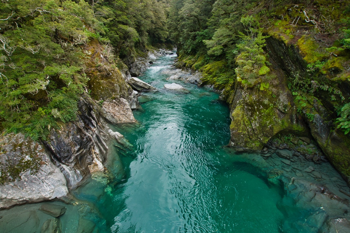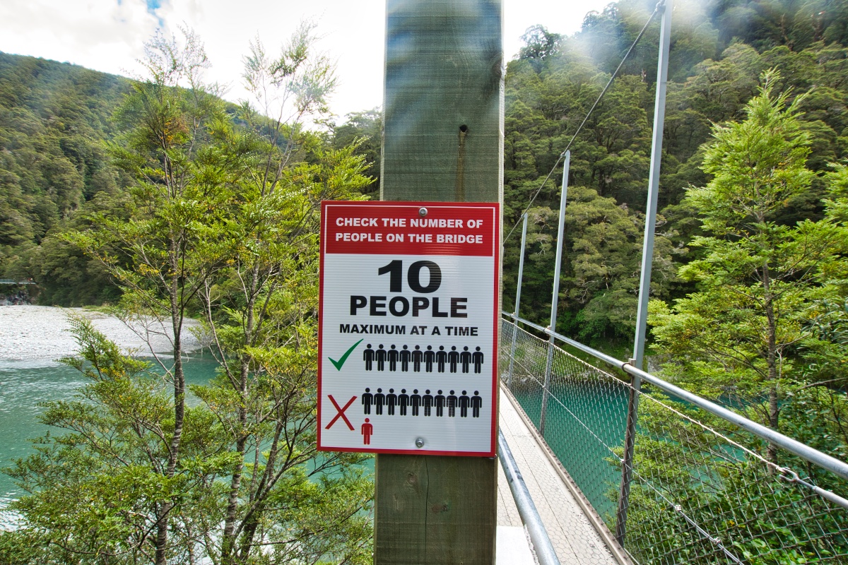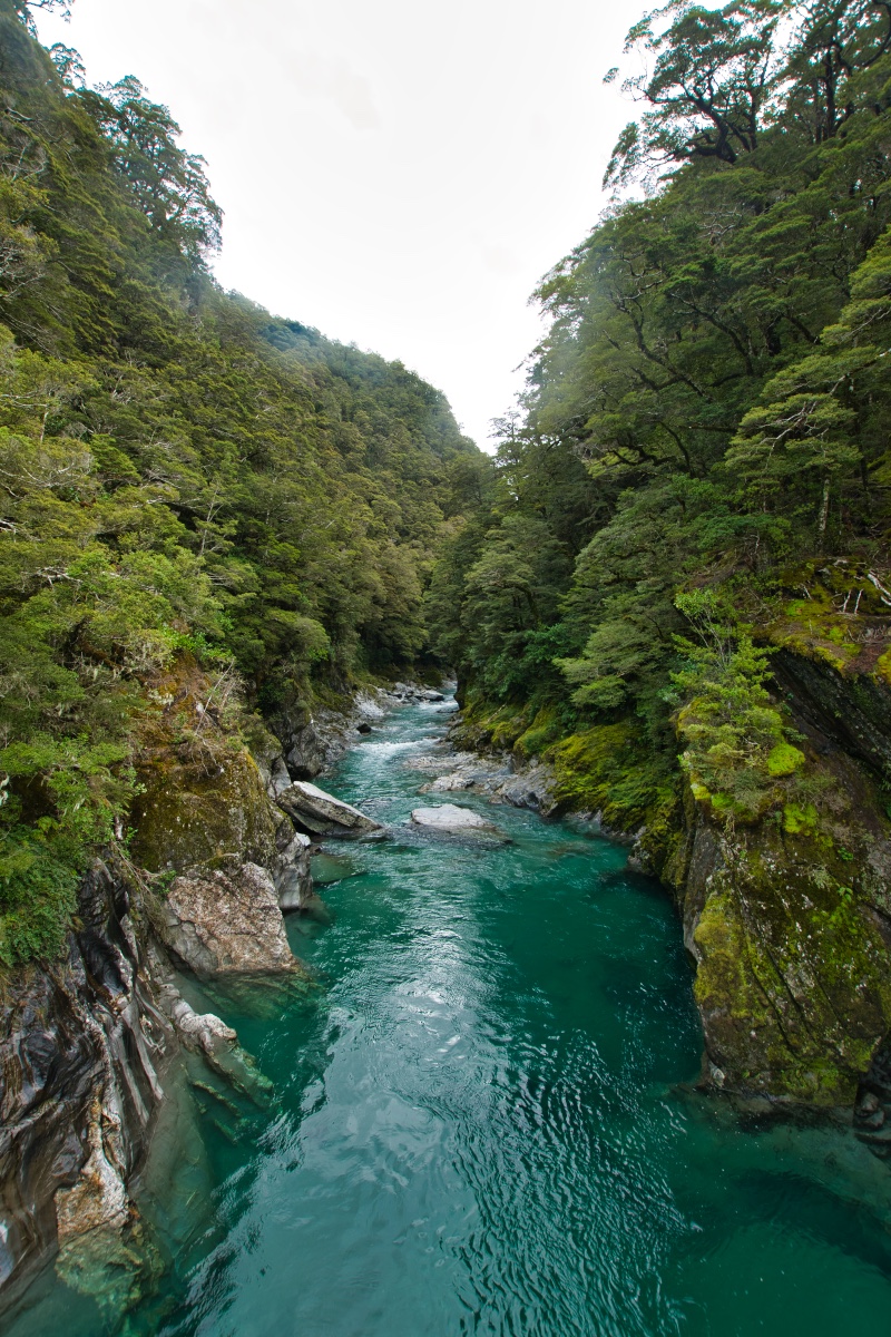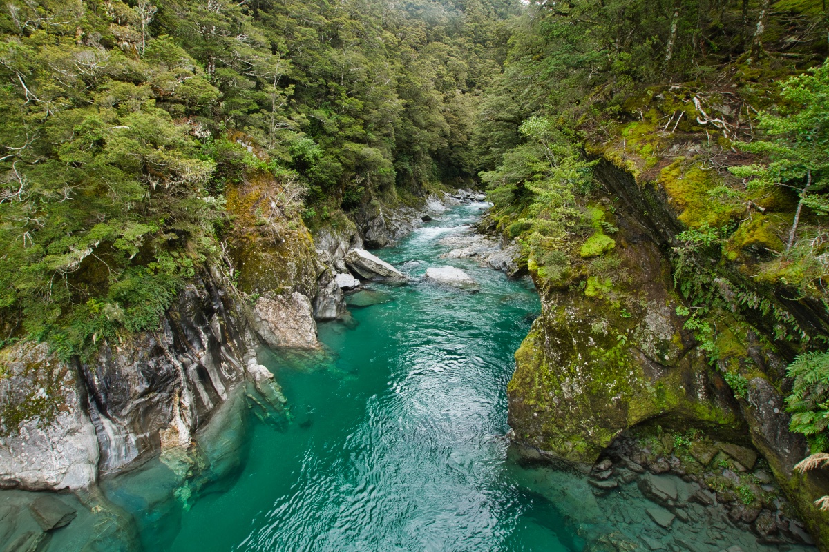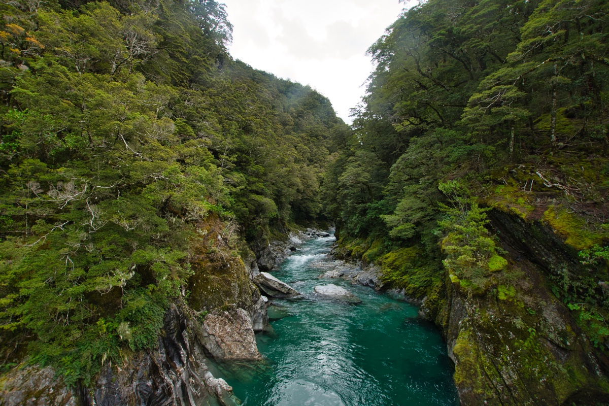 Das Highlight des Tages war dann der kurze Spaziergang zu den sogenannten Blue Pools am Makarora River. Nach einem kurzen Weg durch den Wald ging es über eine Hängebrücke auf die andere Seite des Makarora River. Auf die erste Hängebrücke folgte wenig später eine zweite über den Blue River. Die Blue Pools liegen unterhalb dieser zweiten Hängebrücke und haben ihren Namen von der türkisblauen Farbe des Wassers, die wiederum durch die Brechung des Lichts in dem klaren Gletscherwasser entsteht. Wenn der Blue River viel Wasser führt, schwemmt er eine Menge Gestein vom Oberlauf mit hinunter bis zu den Blue Pools und wenn der Makarora River ebenfalls gerade viel Wasser führt, verhindert dies teilweise das das Gestein in den Makarora River ausgeschwemmt wird. Dann sehen die Blue Pools matschig grau aus. Aber ich hatte Glück – die Blue Pools strahlten im Sonnenlicht im schönsten blau. Unterhalb der zweiten Hängebrücke kann man auch baden, aber ich hatte meine Badesachen nicht dabei und es wäre mir auch sicher zu kalt gewesen im Wasser dieses Bergbaches.