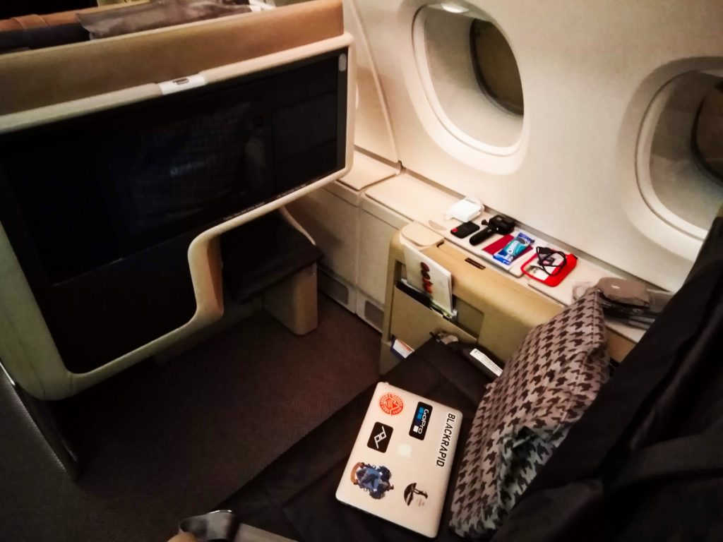Mein Flug nach Neuseeland in der Business Class von Singapore Airlines war – wie auch schon der Flug von Rom nach Singapur – ein tolles Erlebnis. Auf dieser Strecke bin ich im A380 geflogen, bei dem sich die Business Class auf dem Oberdeck rechts und links der vorderen Eingangstür befindet. Ich hatte beim Online Check- In noch meinen Platz von 22K auf 14 K ändern können und saß so in der vorderen, deutlich kleineren Business Class Kabine. Und ich hatte wieder einen Einzelplatz am Fenster.