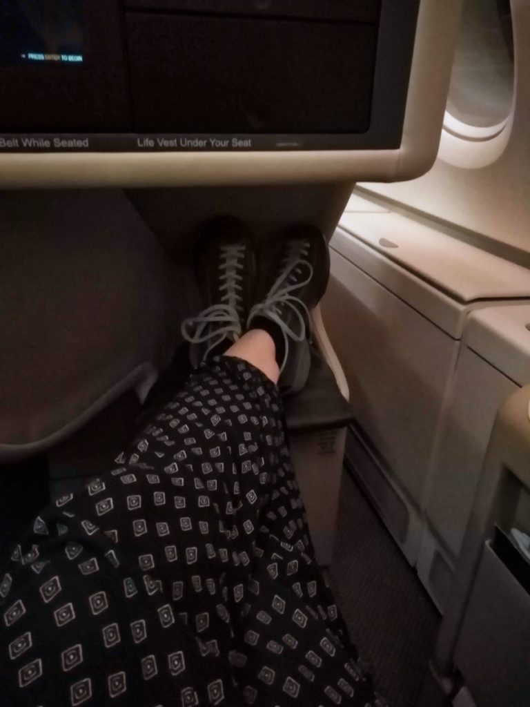 Während des Essens habe ich „Green Book“ geschaut und danach habe ich mir mein Bett machen lassen und versucht, etwas zu schlafen. Vom Platzangebot war der Sitz im A380 etwas besser als im A350, aber auch hier war die Konstruktion des Bettes nicht optimal. Aus irgendeinem Grund reicht die Fußstütze nicht ganz an die Bordwand heran und so fiel mein rechter Fuß immer von der Fußstütze runter, wenn ich die Füße nebeneinander gelegt habe. Mit überkreuzten Füßen oder in Seitenlage ging es aber. Ich habe wohl auch ein paar Stunden geschlafen. Jedenfalls waren wir gerade Mitten über Australien (leider alles dunkel draußen), als ich das letzte Mal auf die Karte geguckt habe, und als ich geweckt worden bin, waren wir schon mitten über der Tasmanischen See.