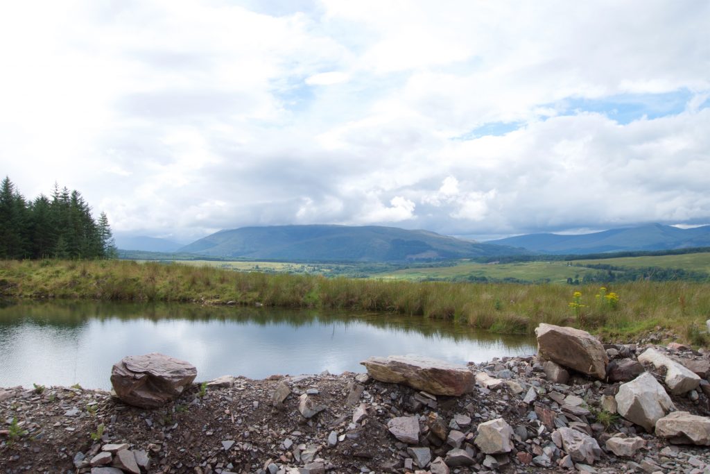 Von hier aus war der Weg nach Spean Bridge nicht mehr weit. Wir liefen zunächst noch über offenes Gelände, wo wir u.a. an diesem ehemaligen, jetzt mit Wasser gefüllten, Steinbruch vorbeikamen.