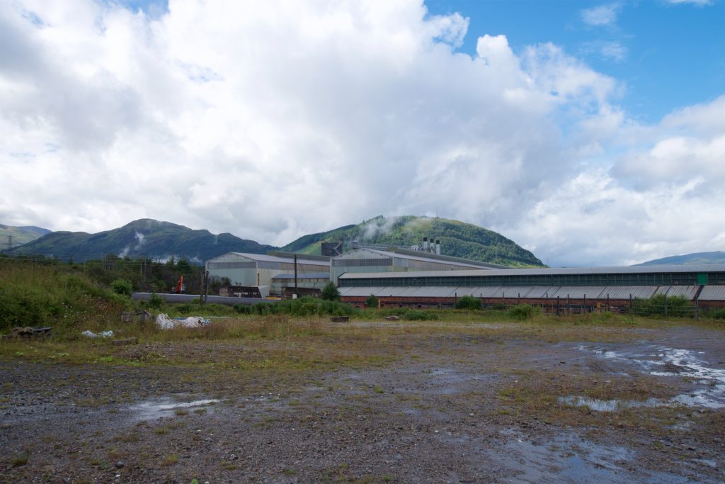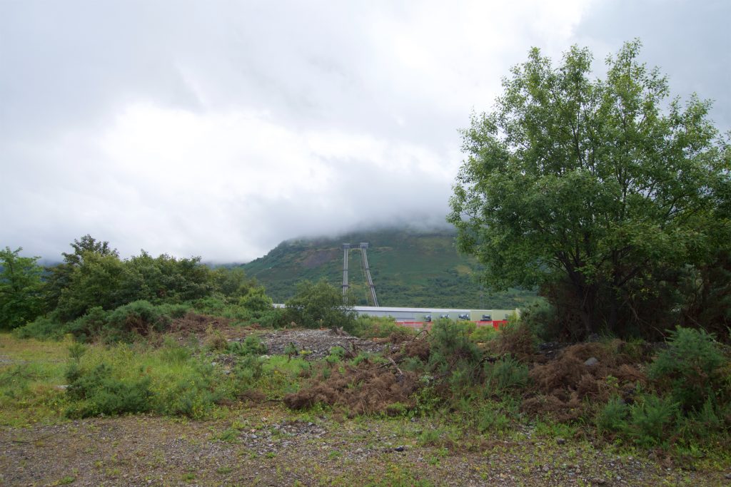 Bald schon kam dann der „Alcan Smelter“ in Sicht. Ab diesem Punkt liefen wir nicht mehr auf einer Straße, sondern auf einem breiten Schotterweg. Am Berghang waren zudem Rohre zu sehen, mit denen einen Wasserkraftwerk mit Wasser versorgt wird.