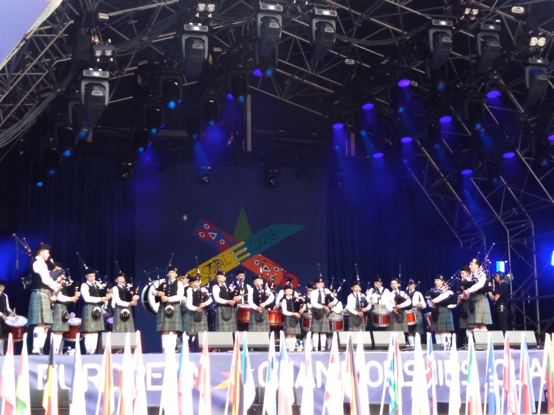 Am Freitag sind wir wieder mit dem Bus in die Stadt gefahren und haben uns zunächst am George Square einen Teil des Rahmenprogramms zu den gerade in Glasgow stattfindenden Europameisterschaften angeschaut. Auf dem Programm standen Auftritte verschiedener Jugend-Dudelsack-Orchester.