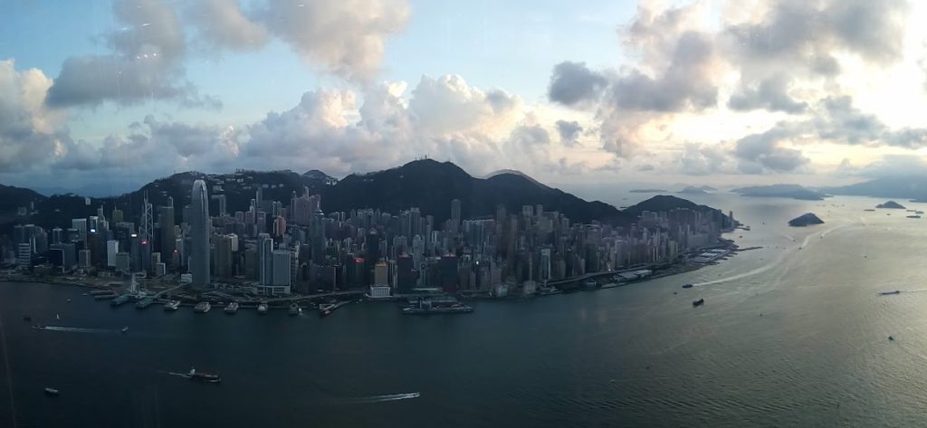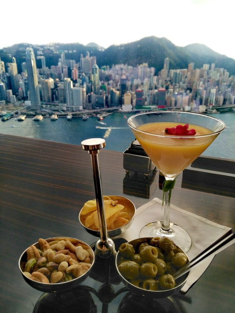 Nachdem ich alles aufgegessen hatte, bin ich einfach sitzen geblieben und habe weiter die Aussicht genossen. Die Lounge war nicht sehr voll und ich hatte nicht den Eindruck, dass man meinen Platz ein weiteres Mal vergeben würde, wenn ich gehen würde. Kurz entschlossen habe ich mir daher einen Kowloon Martini bestellt und auch noch den Sonnenuntergang von der Lounge aus genossen. Herrlich!