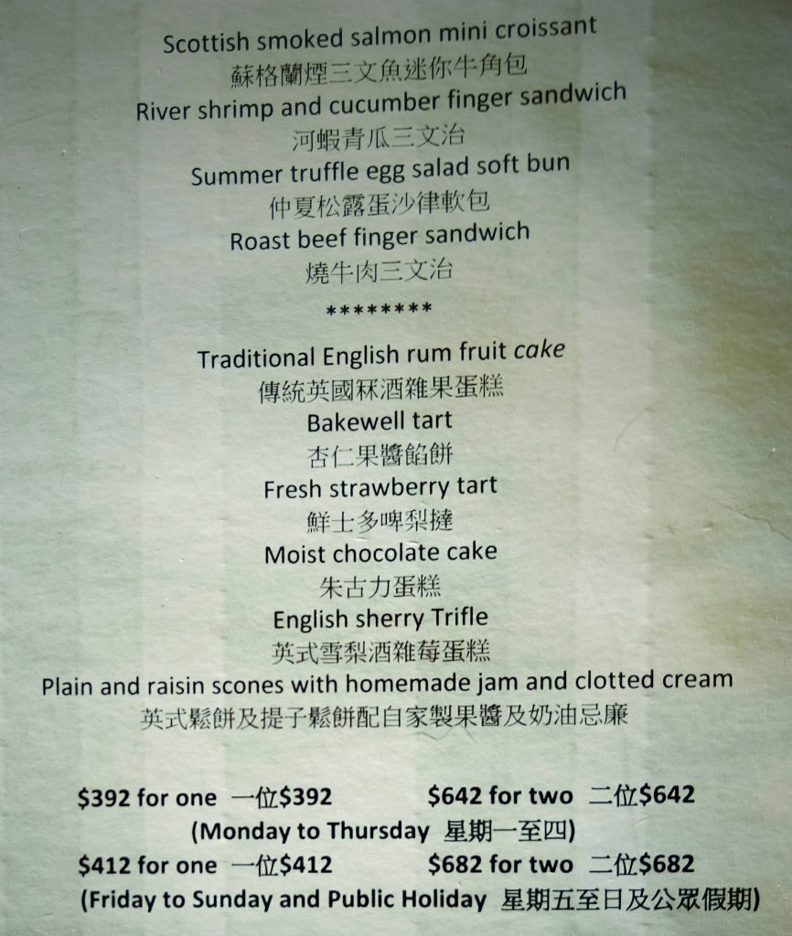 Gegenüber vom Hongkong Space Museum befindet sich das Peninsula Hotel – das vermutlich berühmteste Luxushotel in Hong Kong. Dort kann man in sehr feiner Umgebung einen traditionellen Afternoon Tea genießen. Afternoon Tea stand für mich an diesem Tag auch auf dem Programm, aber nach intensiver Recherche hatte ich mich gegen das Peninsula und für die Lounge & Bar im Ritz Carlton entschieden. Denn zum einen kann man, wenn man kein Hotelgast ist, im Peninsula für den Afternoon Tea nicht reservieren, und zum anderen bietet die Lounge & Bar des Ritz Carlton auch noch einen tollen Ausblick auf Hongkong Island, während man im Peninsula ohne Ausblick in der Lobby sitzt. Preislich tun sich die beiden hingegen nicht viel, im Peninsula kostet der Afternoon Tea für eine Person 388 HKD (= 40 Euro), im Ritz Carlton von montags bis donnerstags 398 HKD (41 Euro) und freitags bis sonntags und an Feiertagen 418 HKD (= 43 Euro).