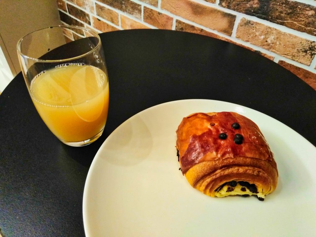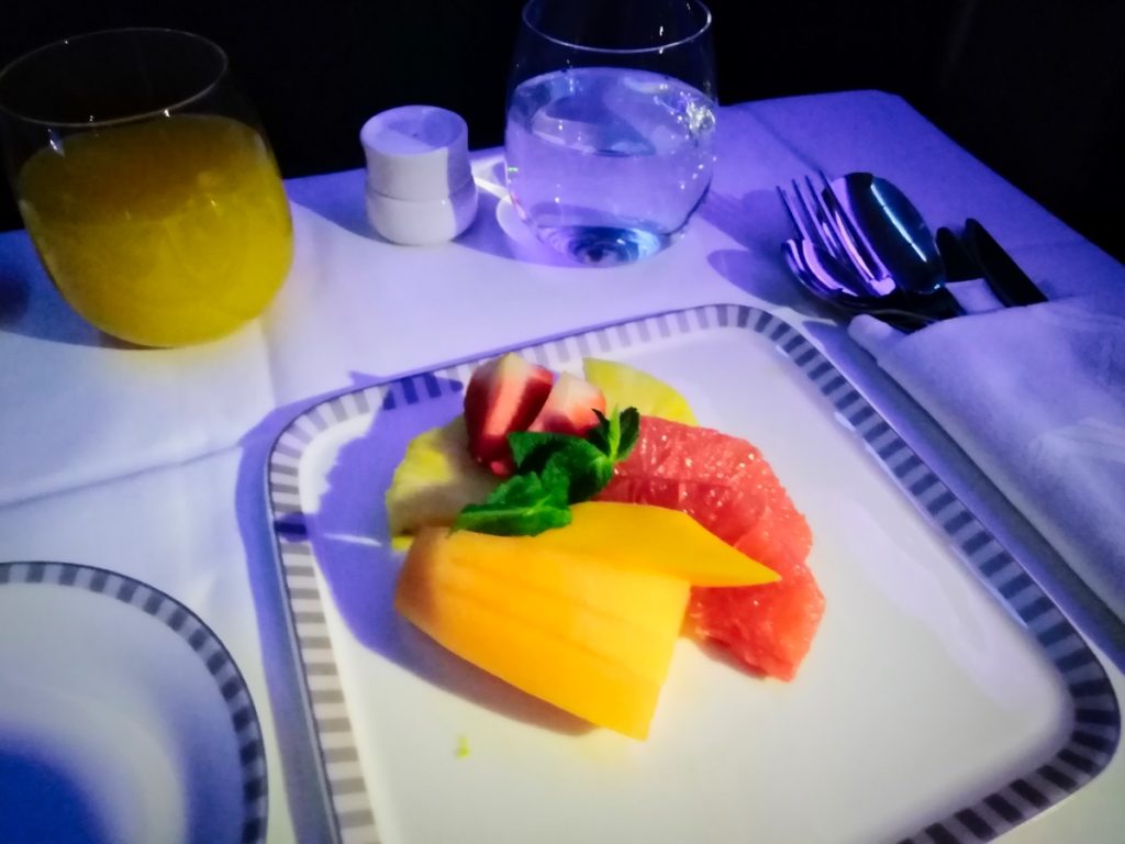 Als erstes gab es frisch gepressten Orangensaft und einen Obstteller. Das Obst war eiskalt (brrrhh), aber bis auf das noch sehr harte Stück Mango trotzdem sehr lecker. Ich habe sogar die Ananas gegessen 🙂