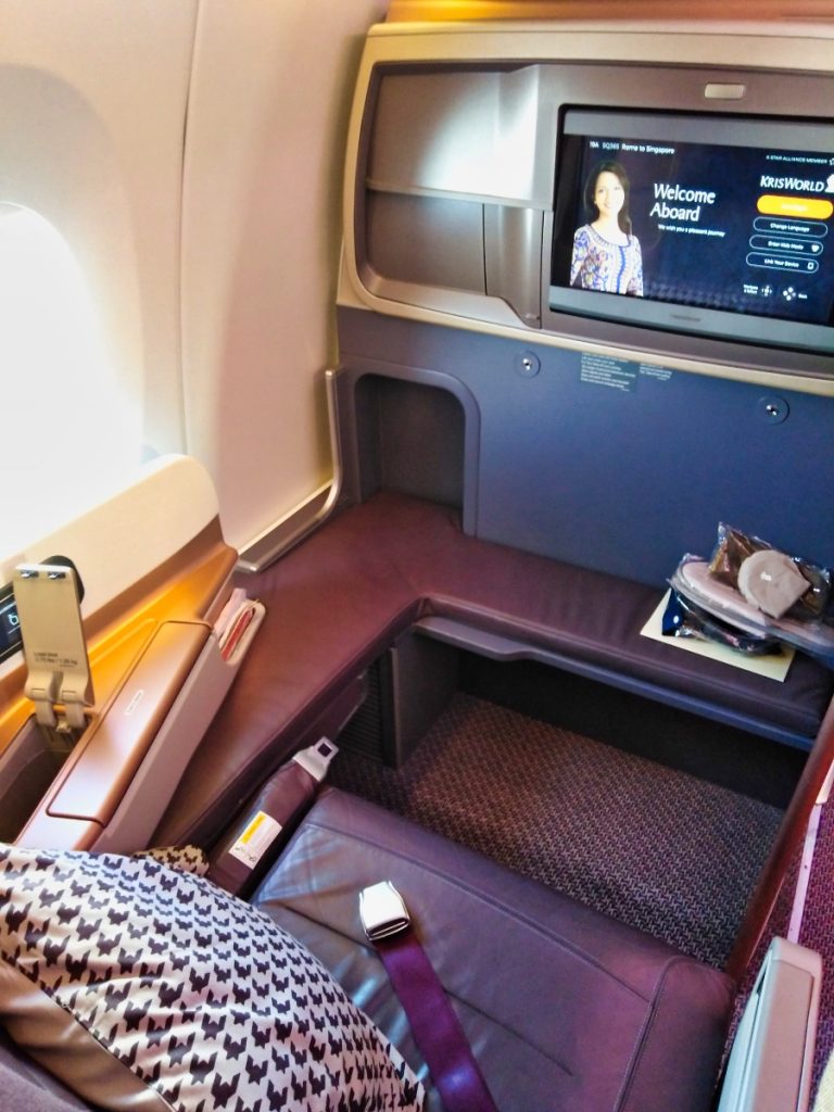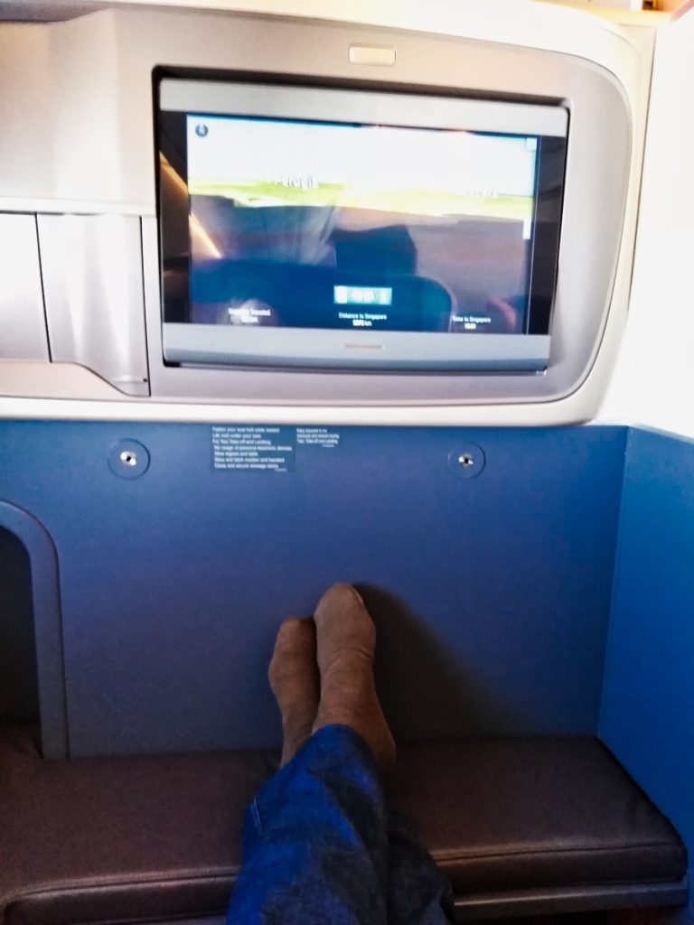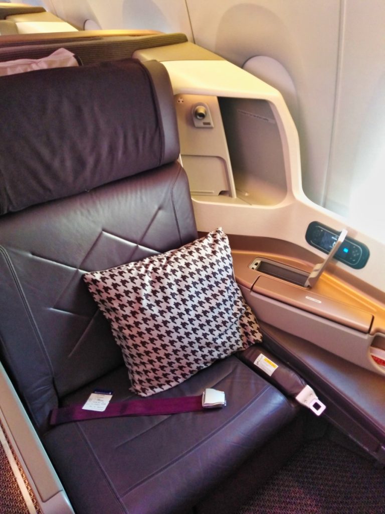 Nach dem Film habe ich versucht zu schlafen, aber es ist mir nicht wirklich gelungen – trotz komplett flachem Bett. Und ich musste dafür nicht einmal meinen Sitz aufgegeben, denn da der Platz auf der anderen Seite des Ganges frei war, habe ich die Flugbegleiterin gebeten, dort mein Bett zu machen. Der Platz im Mittelblock hatte zudem den Vorteil noch mehr Beinfreiheit zu haben. Leider war die Kabinenbeleuchtung schon abgedunkelt, sodass ich kein Bild von meinem Bett machen konnte. Daher hier nur ein Bild von dem Sitz vor dem Umbau – aber ich denke man sieht schon, wie viel Platz man dort hat.