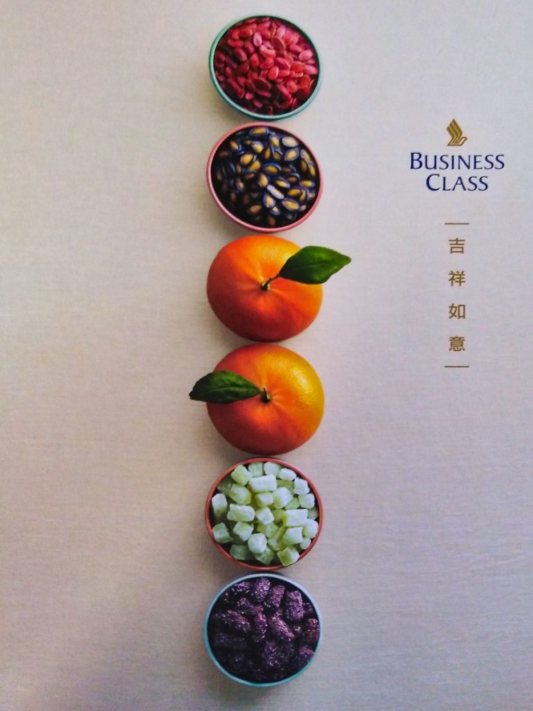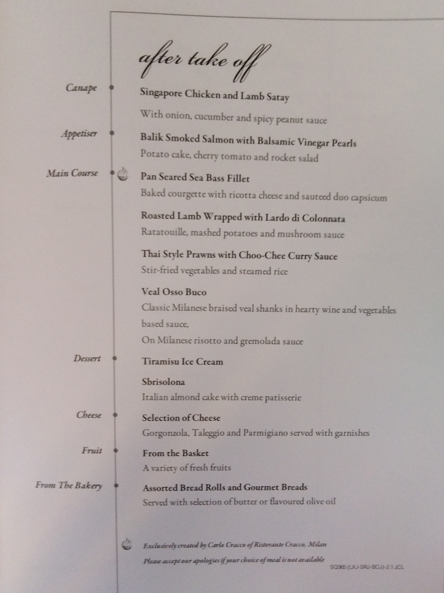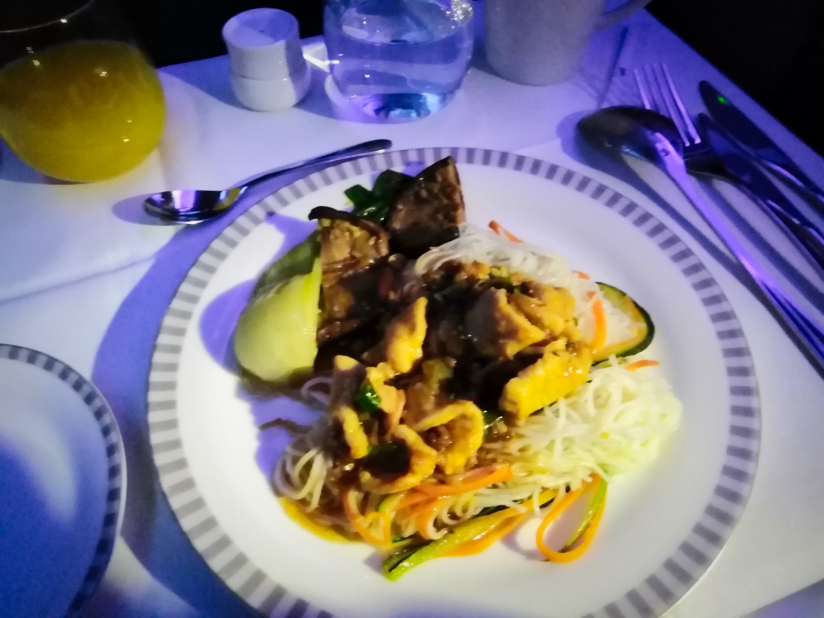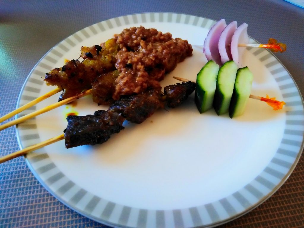 Kurz nach dem Start ging es mit dem Mittagessens-Service los. Als erstes wurde mir ein Teller mit Satay-Spießen vom Hühnchen und vom Lamm gebracht. Lecker!