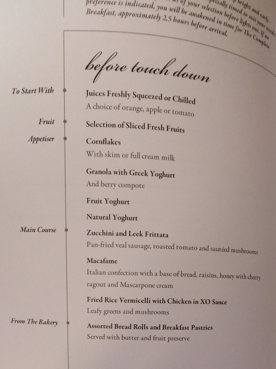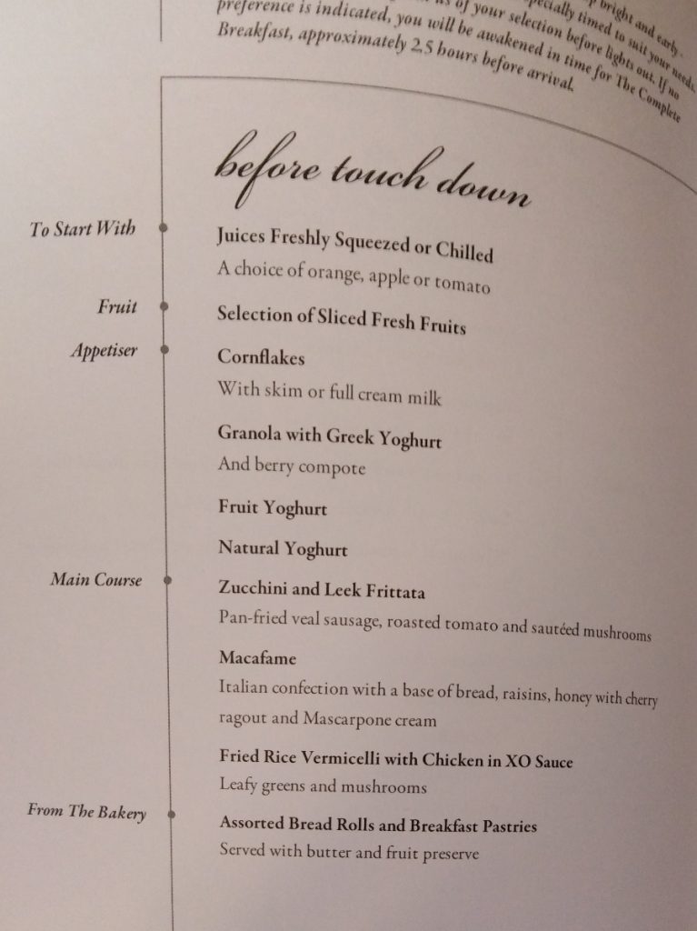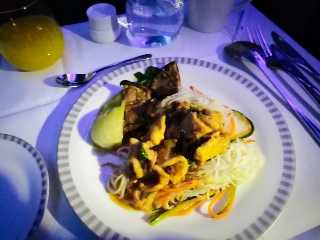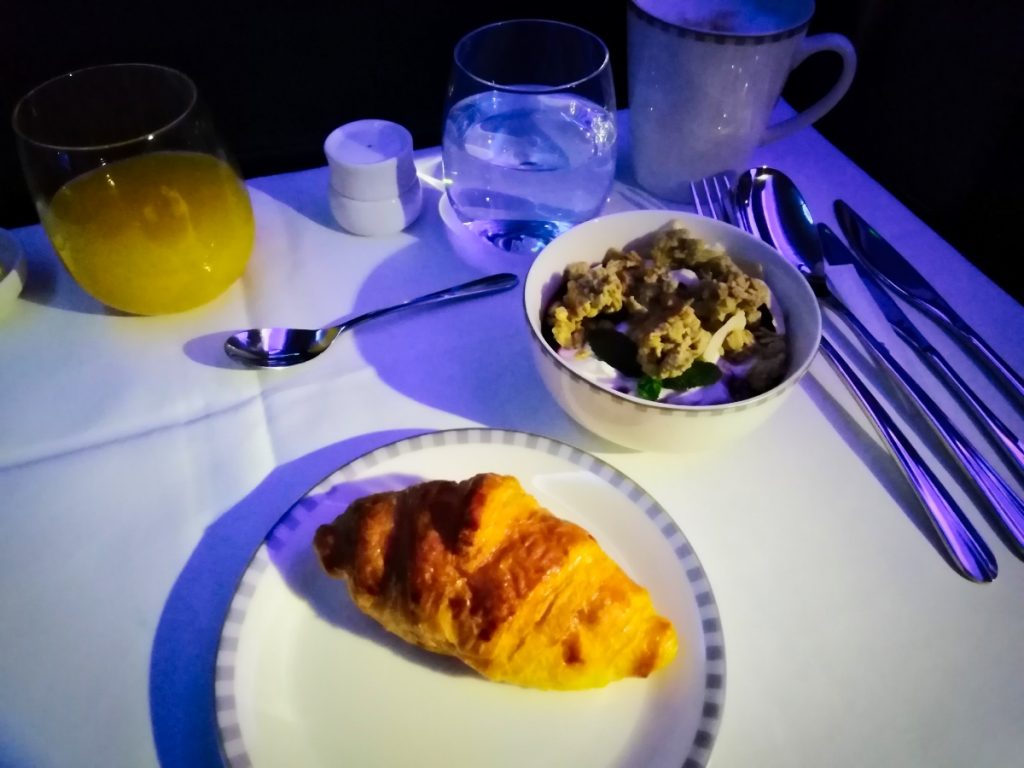 Weil ich danach nicht mehr schlafen konnte, habe ich mich im Anschluss wieder auf meinen Platz gesetzt, Musik gehört, die Flight Show betrachtet und mein Internet-Kontingent genutzt, um kurz online zu gehen und WhatsApp und Facebook zu checken. Gut zwei Stunden vor der Landung, also um 3:40 Ortszeit in Singapur, ging es mit dem Frühstücksservice los.