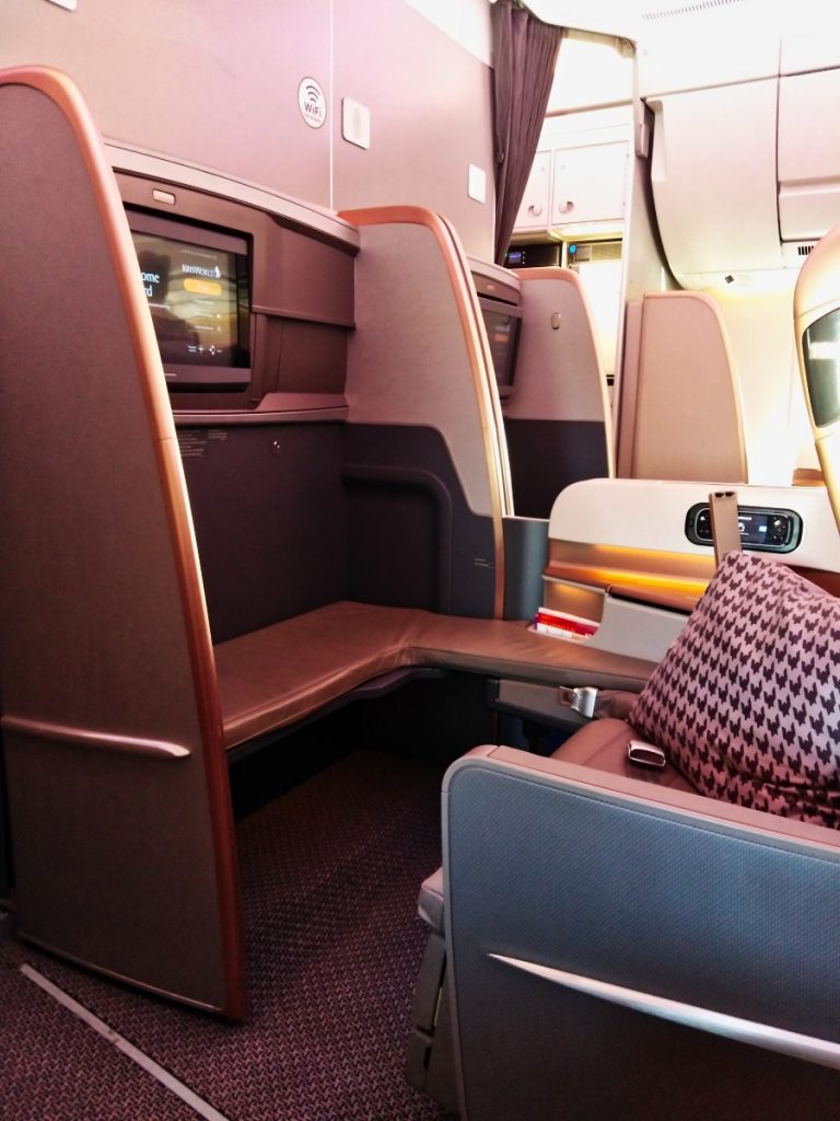 Noch vor der eigentlichen Boarding-Zeit ging es mit dem Boarding los und dieses Mal zahlte es sich richtig aus, dass ich Business Class geflogen bin. Denn so war ich ganz früh und ganz schnell an Bord. Dort teilte eine der Flugbegleiterinnen mir mit, dass mein Sitz, 12A, leider einen Defekt habe und sie mir einen anderen Sitz geben würden. Sie wies mir daraufhin zunächst Platz 20A in der zweiten Reihe der zweiten, nur vier Reihen umfassenden Business Class-Kabine zu. Als das Boarding fertig war und immer noch niemand auf dem Bulkhead-Sitz (mit mehr Beinfreiheit) vor mir saß, habe ich gefragt, ob ich mich dort hinsetzen könnte. Ich durfte!