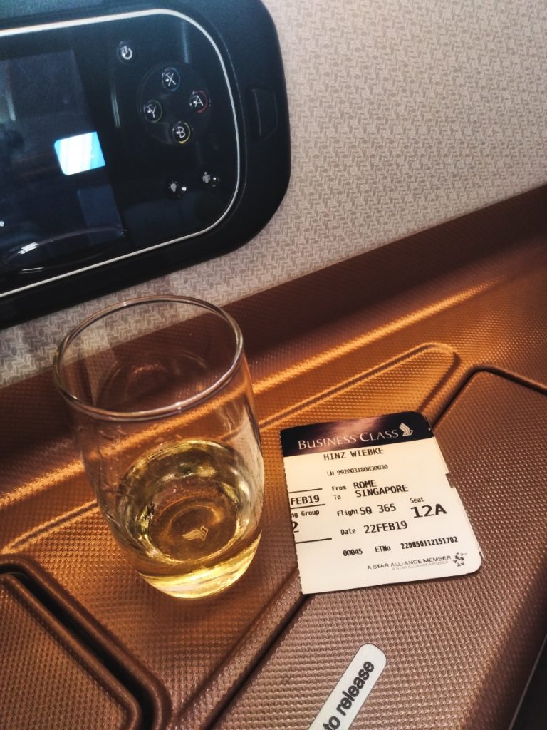 Die Passenger Lounge, die neben Singapore Airlines auch von einer ganzen Reihe anderer Airlines genutzt wird, war ziemlich enttäuschend. Sie befand sich im Keller und bot kein Tageslicht und dementsprechend auch keine Ausblicke. Ich habe mich trotzdem ein paar Minuten dort hingesetzt und am Ende vor lauter Langeweile noch ein Teilchen gegessen und einen Saft getrunken. Noch nicht mal richtigen Kaffee gab es – nur aus dem Automaten. Da war die Lounge von Lufthansa in Frankfurt um Meilen besser – dort gab es immerhin ein Bar mit Barista, der einem einen echten Espresso gemacht hat.