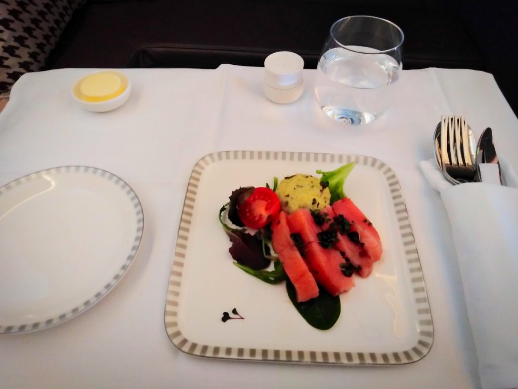 Weiter ging es mit der Vorspeise – geräuchertem Lachs mit Kartoffeltaler und Salatbeilage. Der Lachs war auch super lecker!