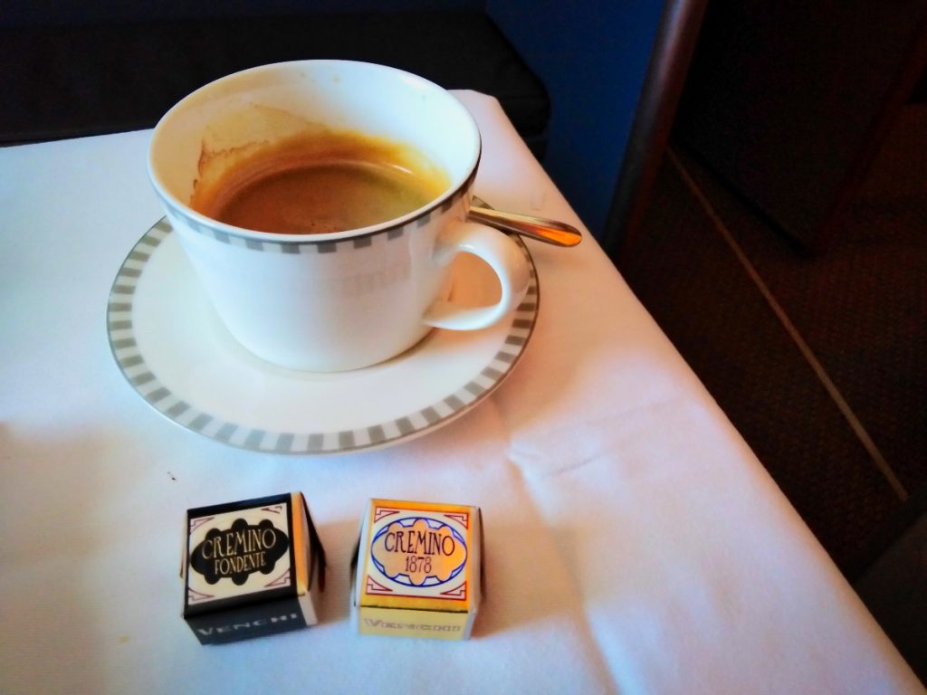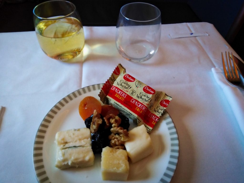 Nach der Nachspeise gab es noch eine kleine Käseauswahl – ich habe die Flugbegleiter einfach etwas zusammenstellen lassen, aber man hätte auch selber wählen können – und zum Abschluss einen Espresso mit Pralinen.