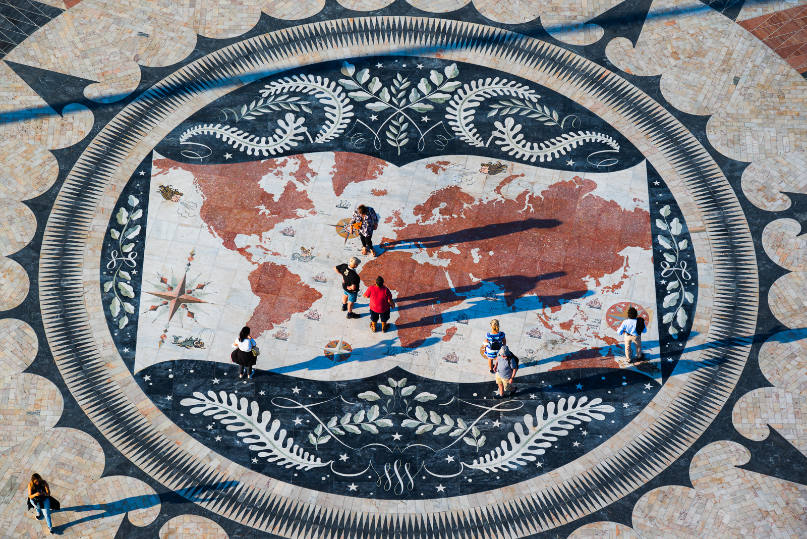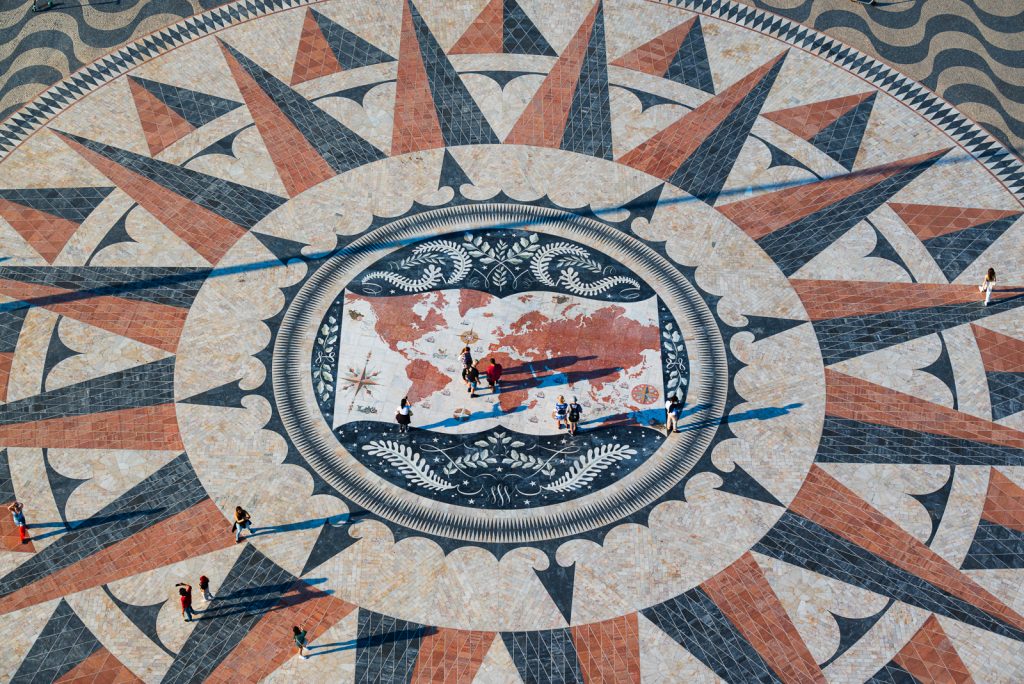 Von dort oben hat man auch einen guten Blick auf die Windrose aus Mosaiksteinen auf dem Boden vor dem Eingang. Eine Weltkarte im Zentrum des Mosaiks zeigt die Routen der portugiesischen Entdecker im 15. und 16. Jahrhundert.