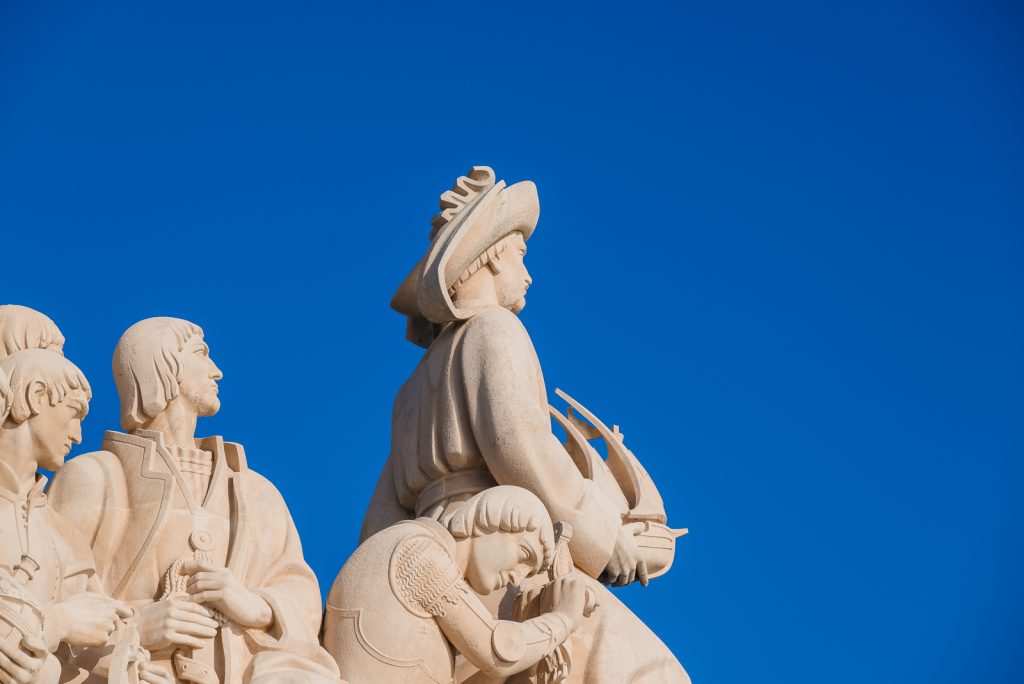 Nachdem ich ausgiebig den Kreuzgang und einige von dort abzweigende Räume erkundet hatte, habe ich das Kloster wieder verlassen und bin durch den Jardim da Praça do Império in Richtung Tejo zum Padrão dos Descobrimentos, dem Denkmal der Entdeckungen, gelaufen. Es wurde 1960 zum 500. Todestag von Heinrich dem Seefahrer errichtet und soll an das Zeitalter der Entdeckungen erinnern. Es zeigt 33 wichtige Persönlichkeiten des Spätmittelalters in Portugal, u.a. Vasco da Gama und Ferdinand Magellan.