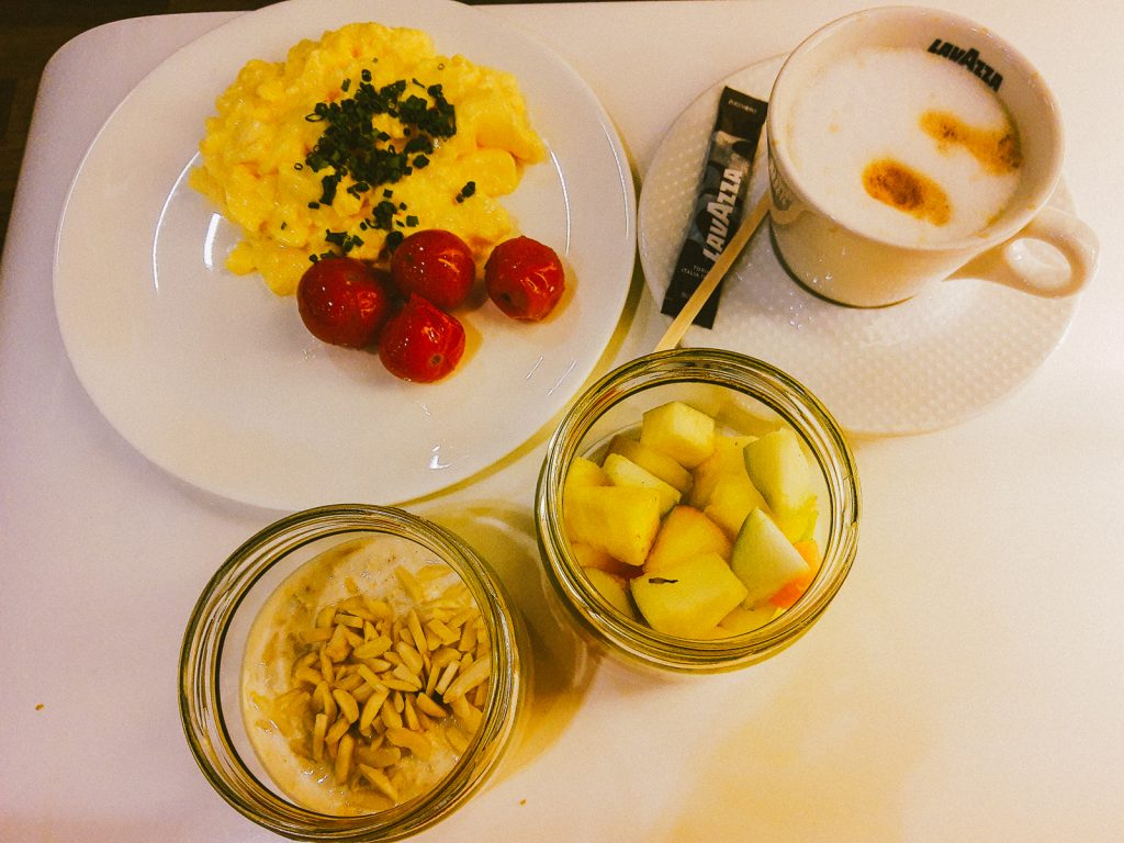 Meine Reise nach Portugal begann mit einem frühen Flug von Frankfurt nach Lissabon. Schon um kurz vor sechs Uhr morgens habe ich daher den ICE von Köln nach Frankfurt genommen. Da ich dieses Mal Business Class geflogen bin, konnte ich die Wartezeit bis zum Boarding in der Lounge verbringen. Corona sei Dank sogar in der ansonsten für Business Class Gäste nicht zugänglichen Senator Lounge. Die Lounge habe ich dann auch in vollen Zügen ausgekostet – nach einer erfrischenden Dusche gab es ein kleines Frühstück und auch ein Glas Prosecco.