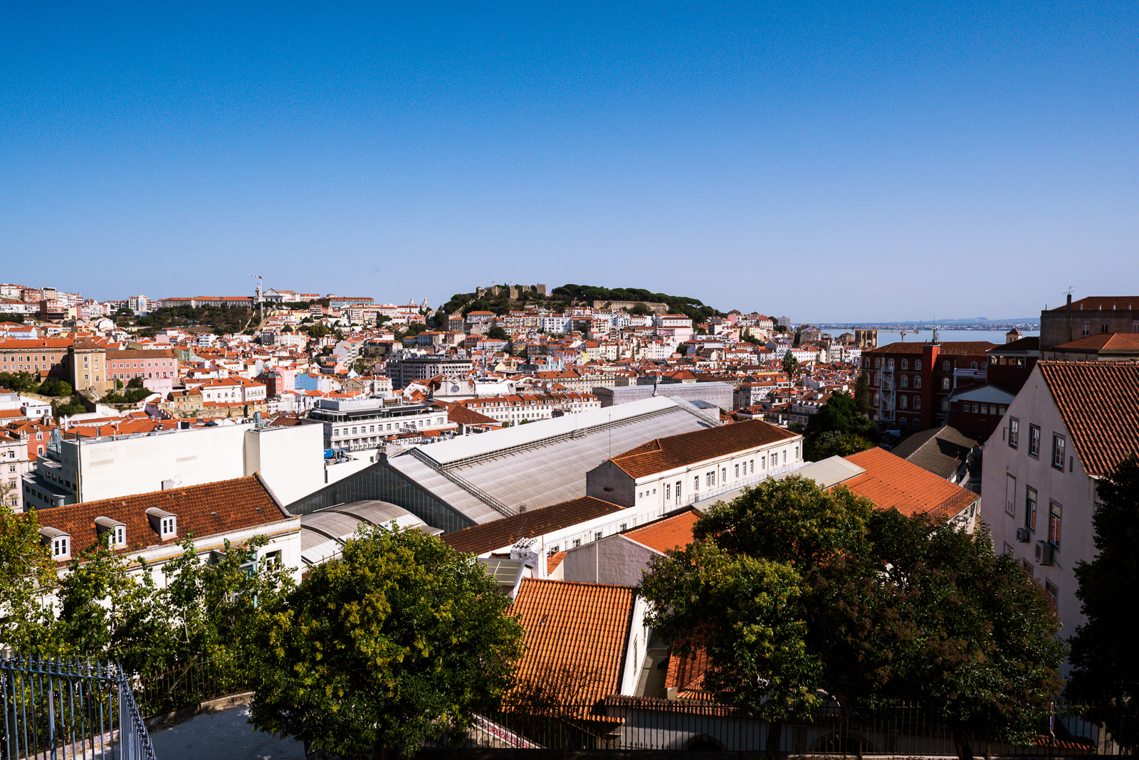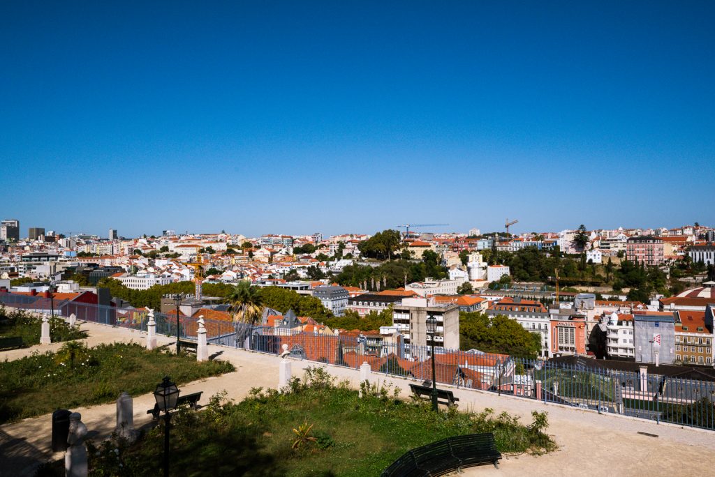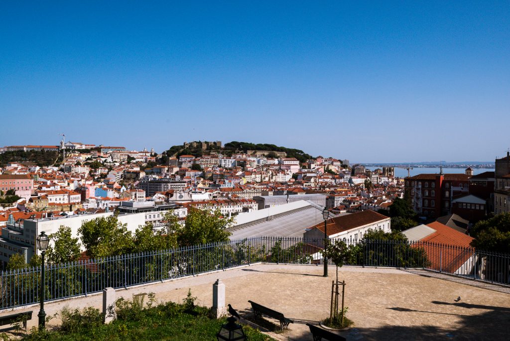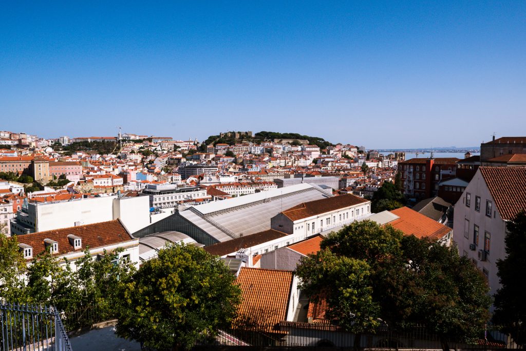 Ich war etwas zu früh da und konnte noch nicht einchecken, aber ich konnte zumindest meinen Koffer abgeben. Die Dreiviertelstunde bis zum Check-in habe ich für einen ersten Spaziergang zum Miradouro de São Pedro de Alcântara genutzt, der nur etwa fünf Minuten entfernt liegt. Von dort hat man einen sehr schönen Blick über Lissabon in Richtung der maurischen Burganlage Castelo de S. Jorge.