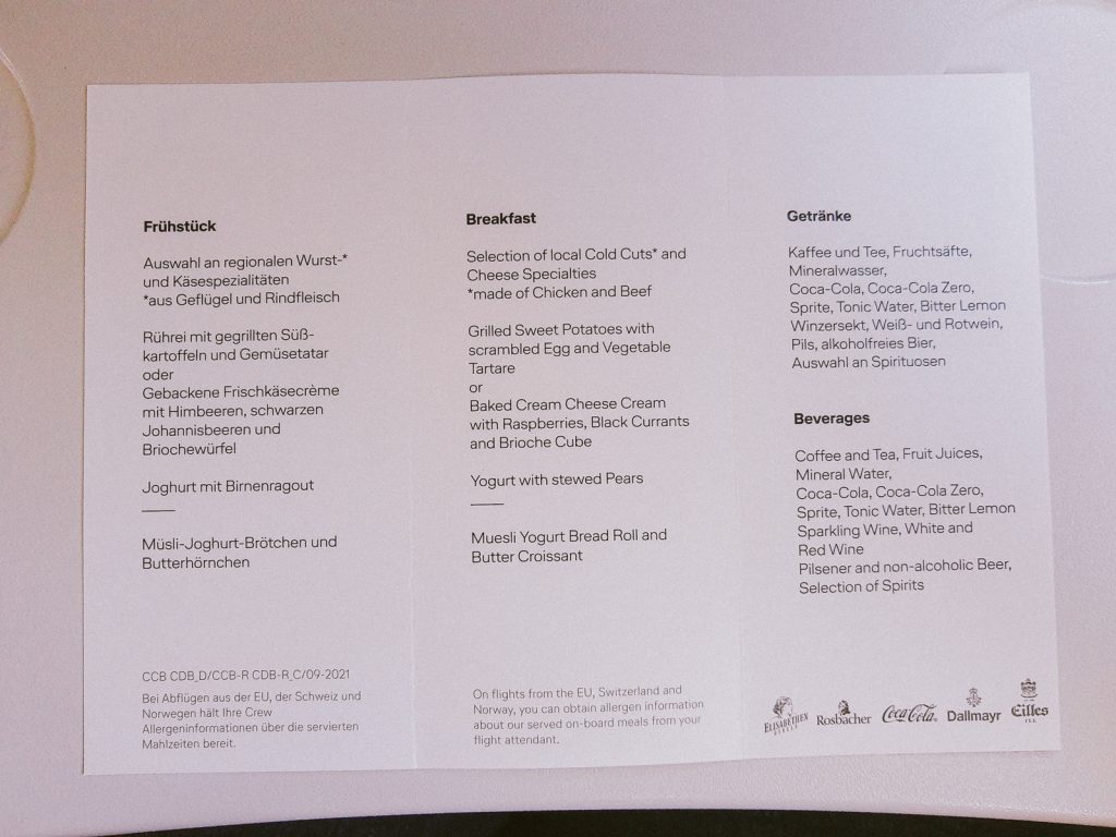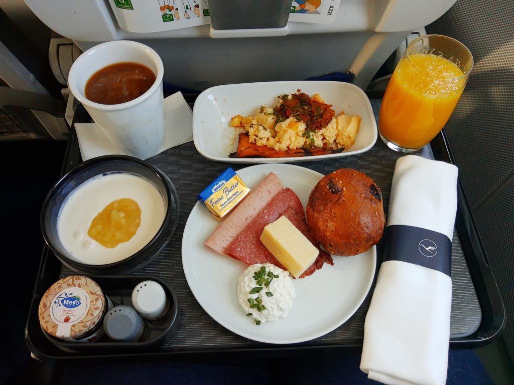 Im Flieger gab es dann ein zweites Frühstück – Lufthansa hat ein neues Caterina-Konzept in der Business Class – „Tasting Heimat“. Ich bekam sogar eine kleine Speisekarte – auf meinem Flug nach Lissabon war Hamburg Pate für das Menü. So ganz habe ich die Verbindung zu Hamburg allerdings nicht herstellen können, bei dem was dann serviert wurde. Geschmeckt hat es trotzdem.