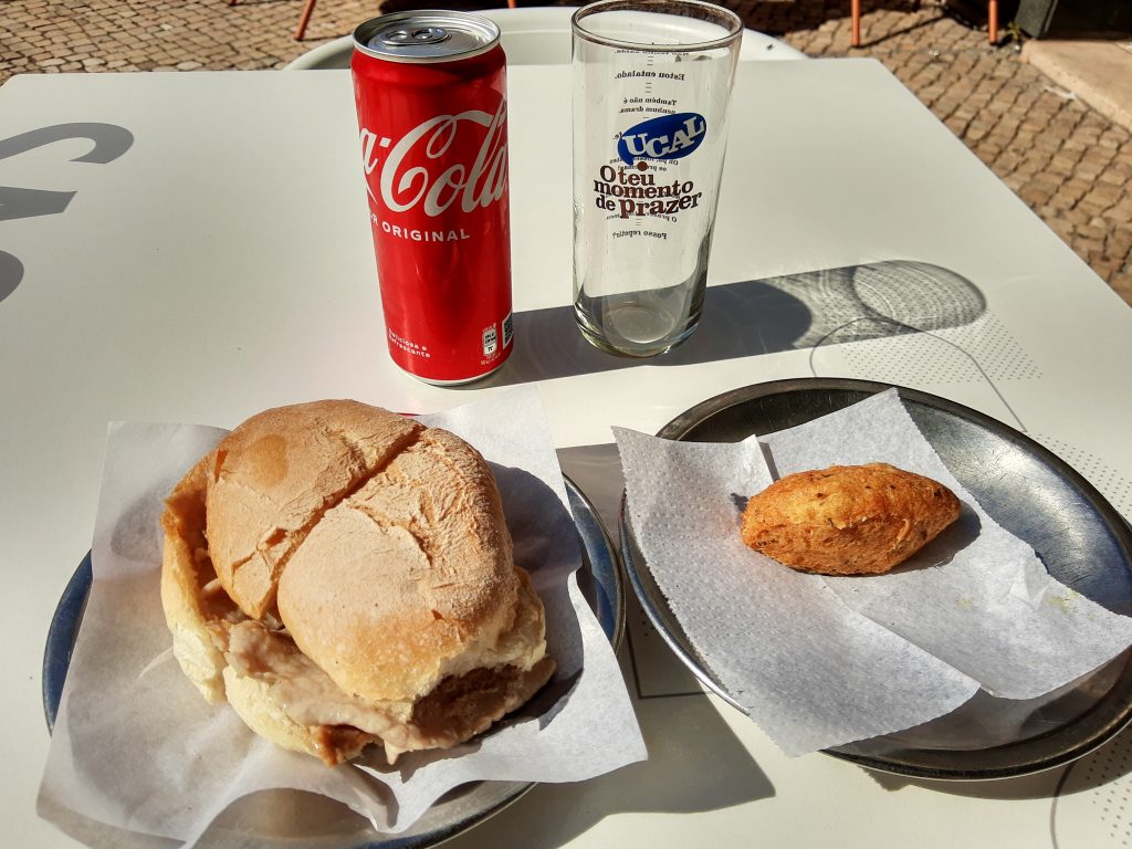 Den Nachmittag habe ich mit einer privaten Foodtour durch Lissabon verbracht. Vom Miradouro de São Pedro de Alcântara ging es durch Bairo Alto in die Baixa. Beim ersten Stopp (O Trevo an der Praça Luís de Camões) habe ich Bifana probieren dürfen, eine Art in Sud geschmortes Schnitzel im Brötchen. Sehr lecker. Ich habe während der Tour keine Fotos gemacht, aber ich war an meinem letzten Tag in Lissabon noch einmal bei O Trevo und habe mir noch ein Bifana und eine Stockfischkrokette gegönnte – hier also ersatzweise das Bild davon.
